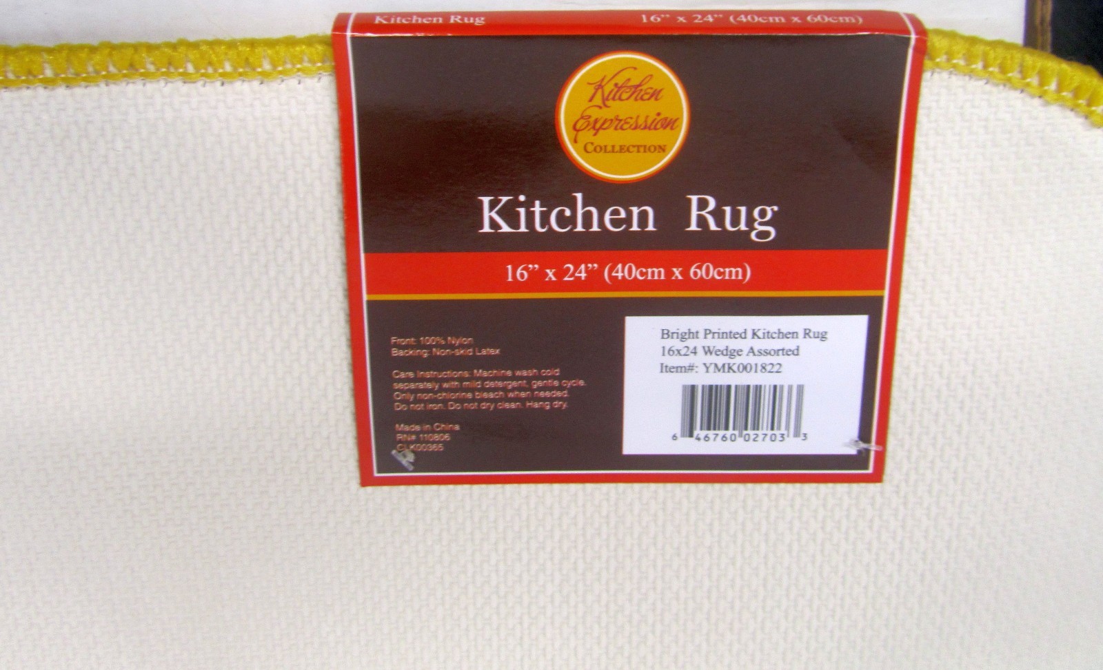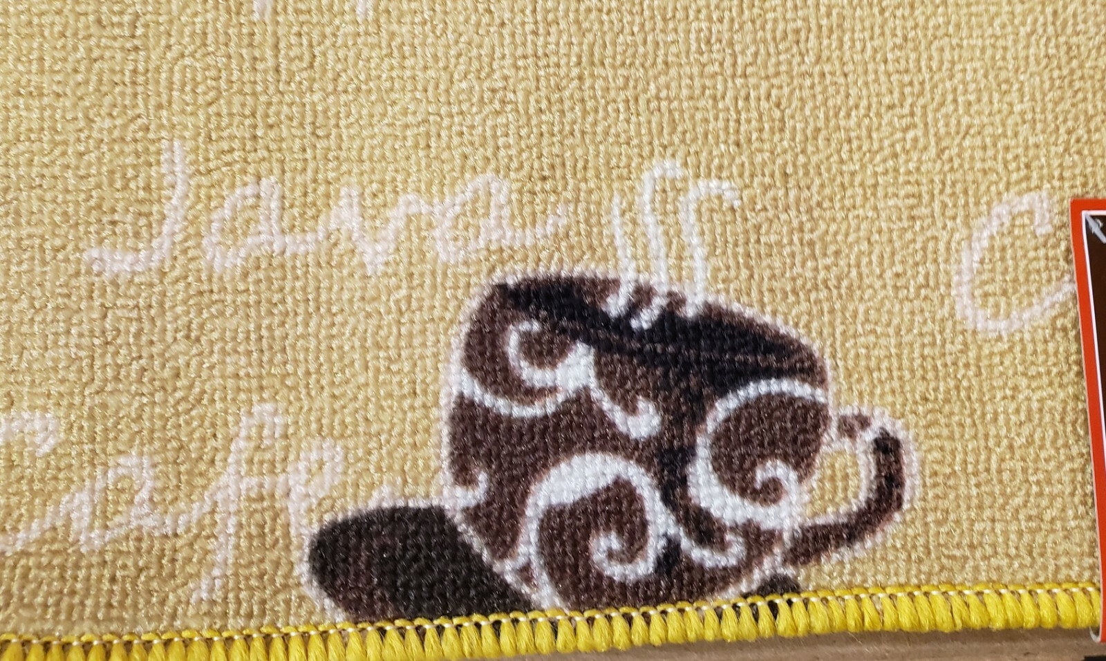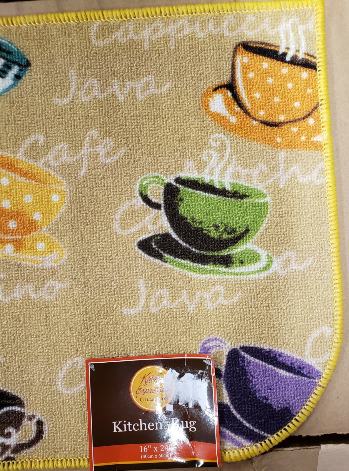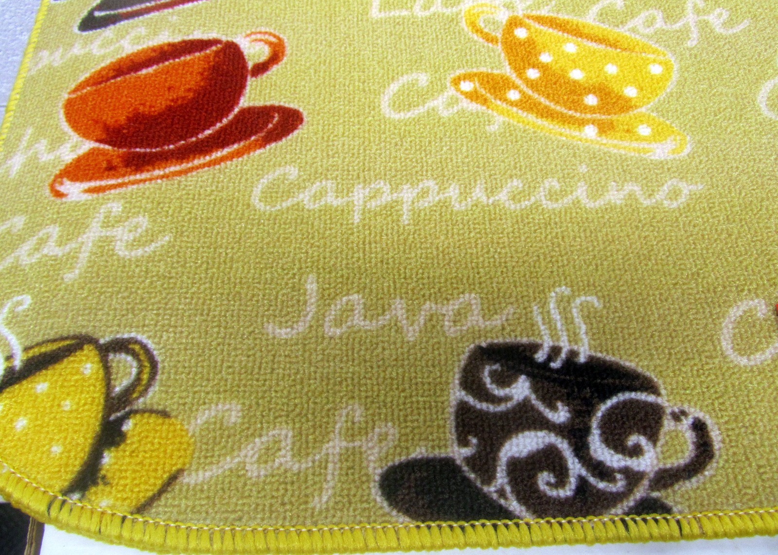 PRINTED NYLON KITCHEN RUG nonskid 16x24 9 COFFEE CUPS ON YELLOW,D Shape, KE