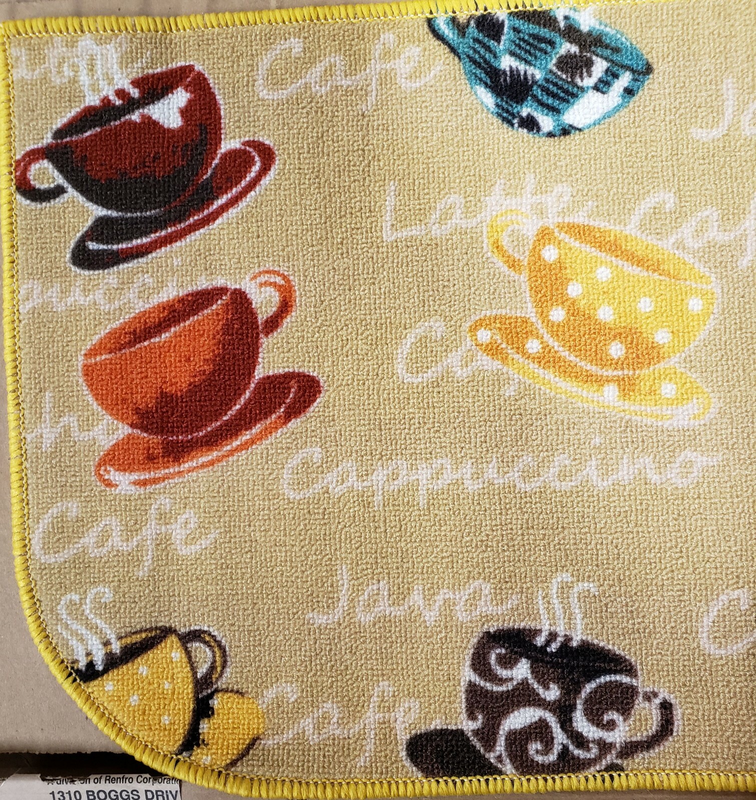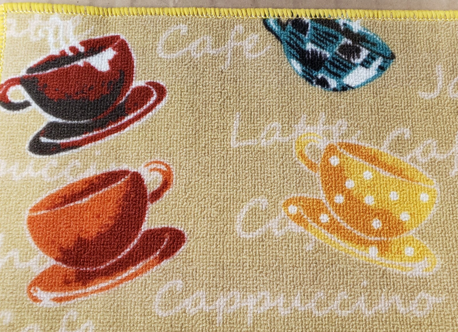 как выглядит PRINTED NYLON KITCHEN RUG nonskid 16"x24" 9 COFFEE CUPS ON YELLOW,D Shape, KE фото