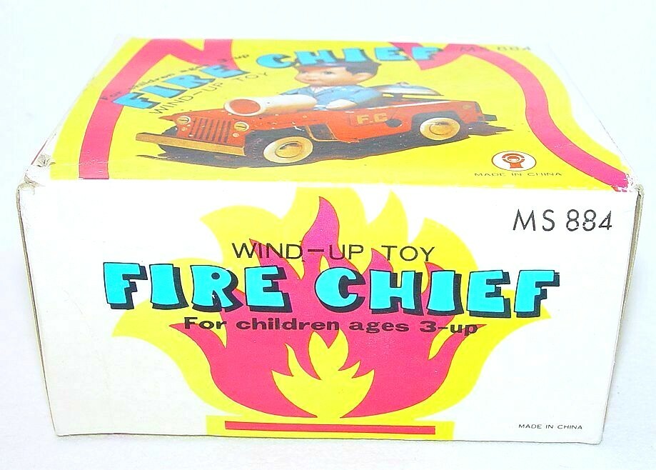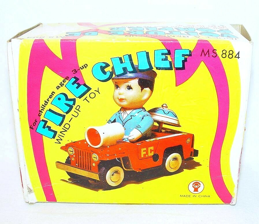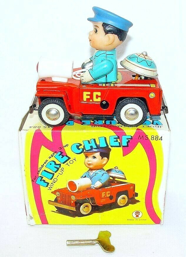 China MS-884 WILLYS JEEP FIRE CHIEF Tin Toy Wind-Up Car 13cm MIB 76 TOP RARE