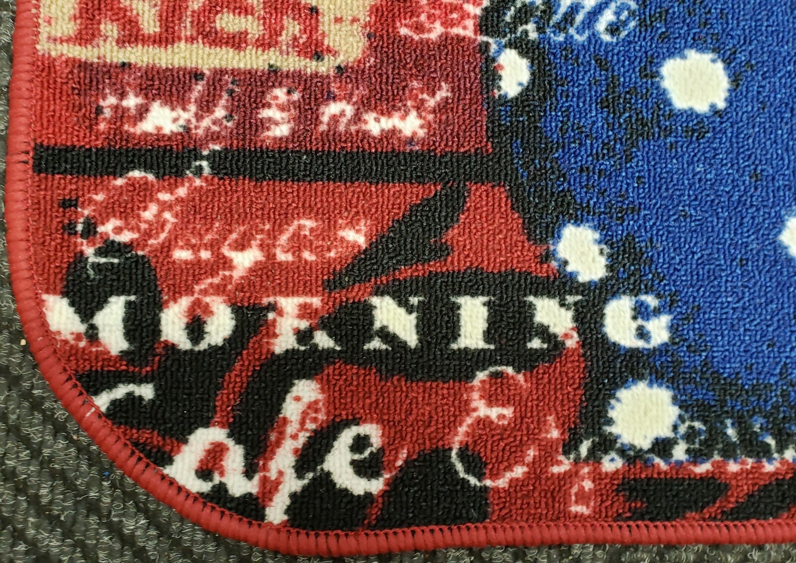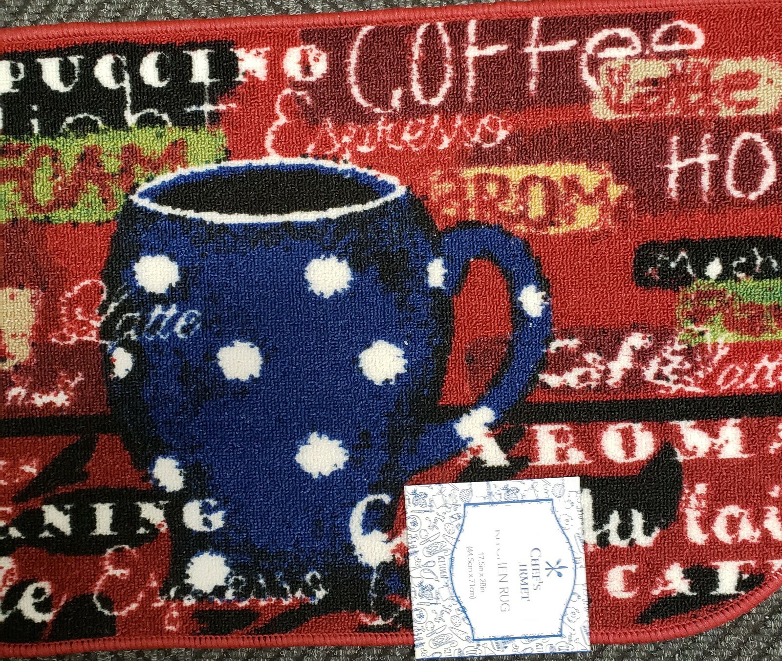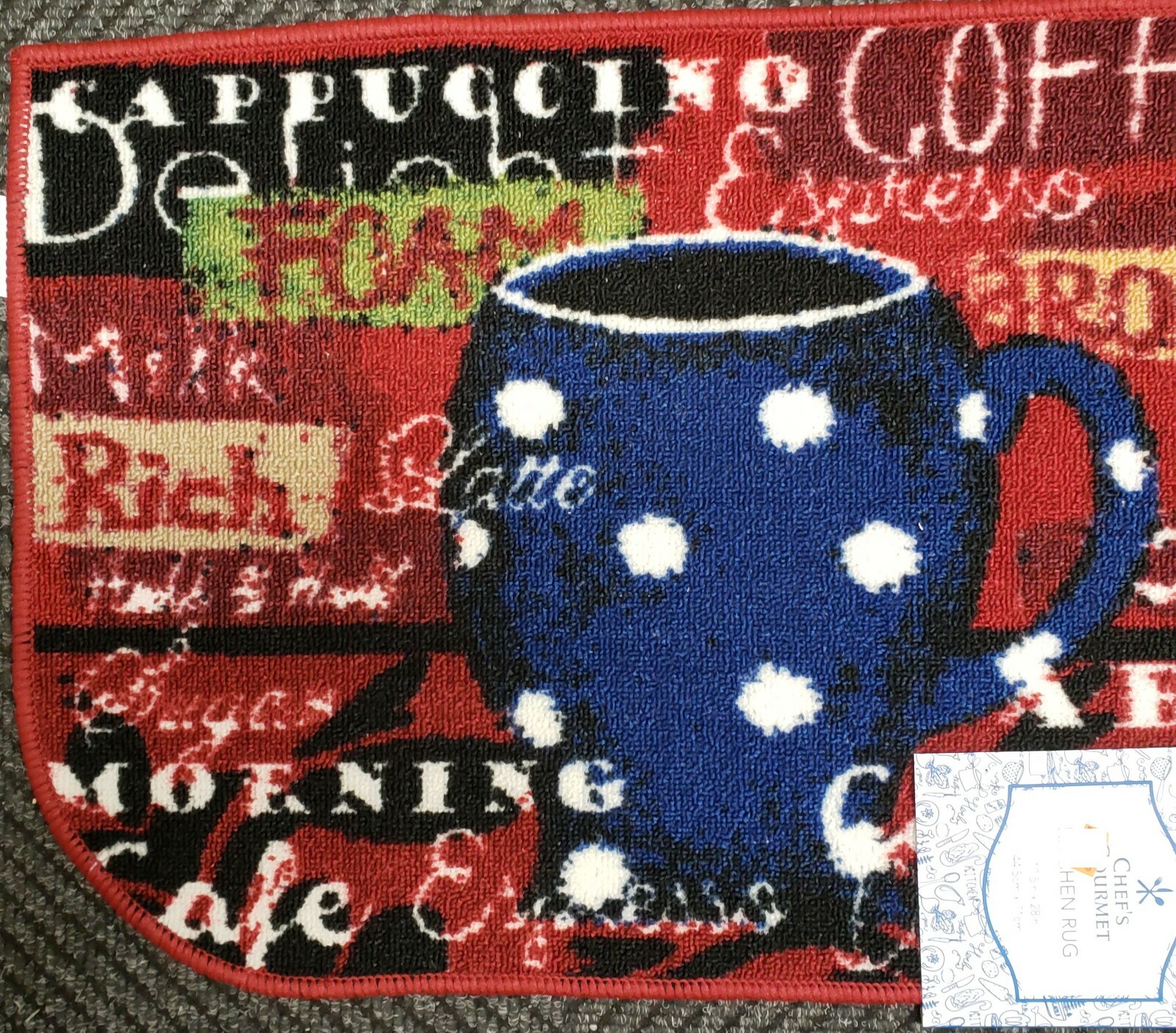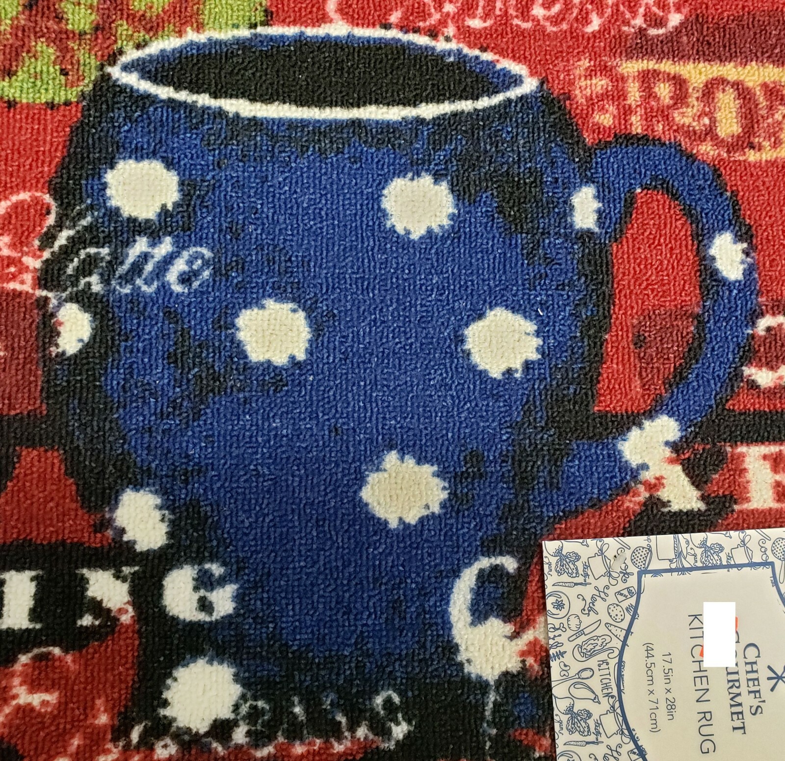 PRINTED NYLON KITCHEN RUG nonskid 18x28 LARGE BLUE COFFEE CUP, D SHAPE,CG