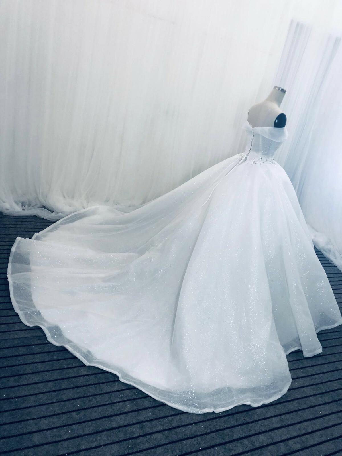 Classic off the shoulder white wedding dress ball gown glitter tulle with train