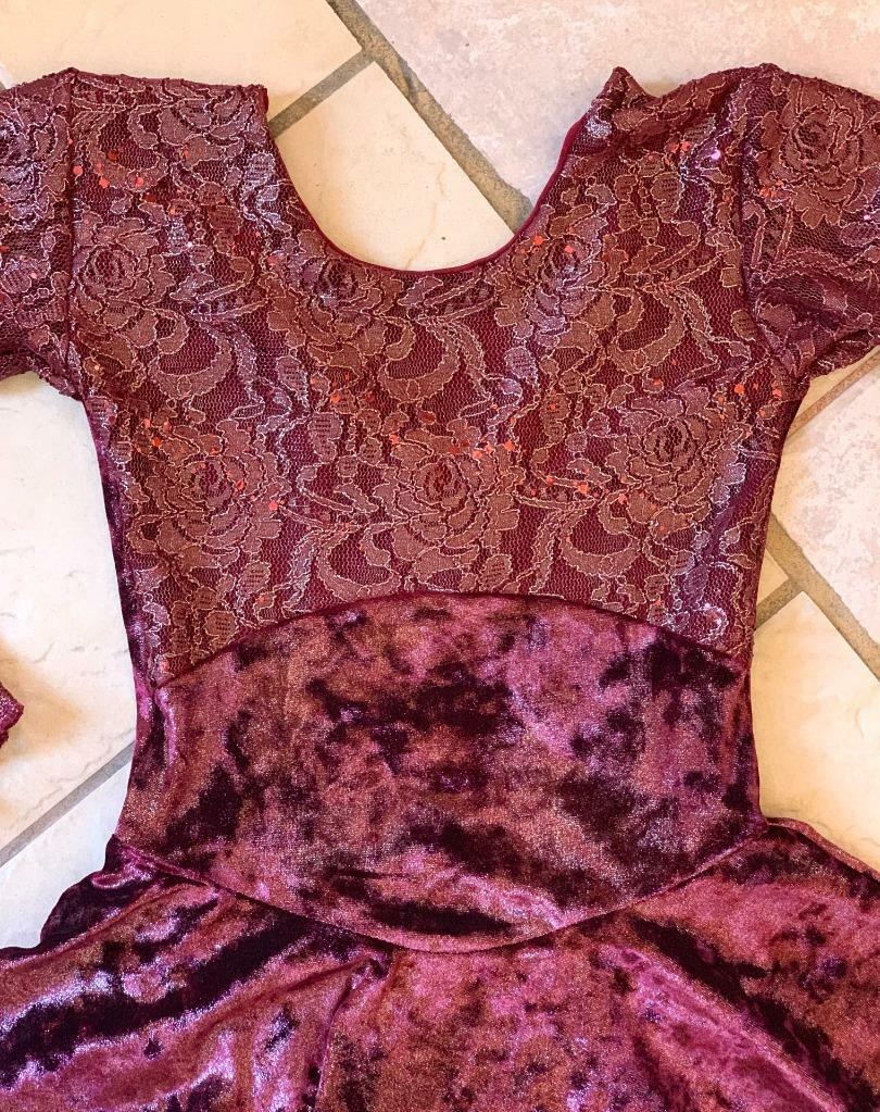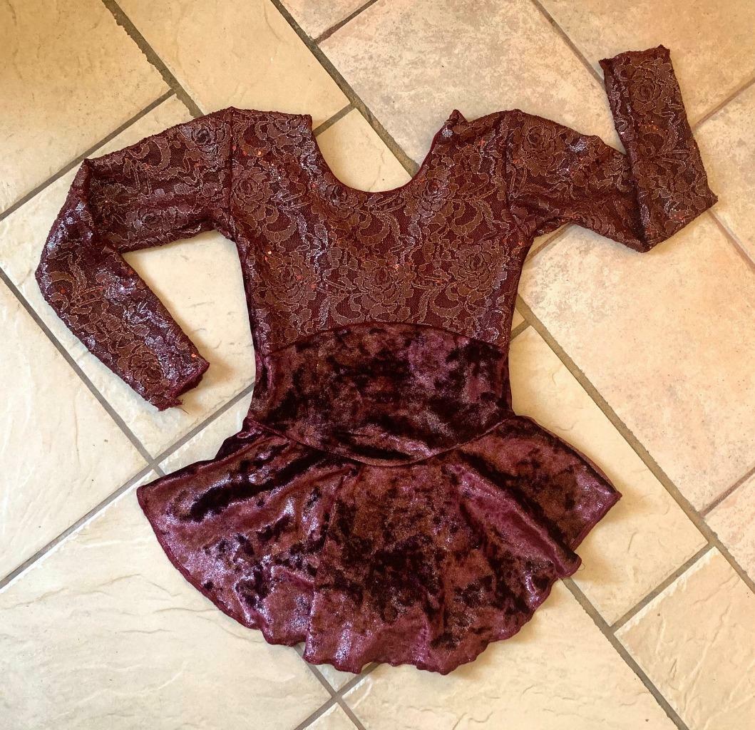 NEW Girls BURGUNDY VELVET Glittery LACE Competition FIGURE ICE SKATING DRESS