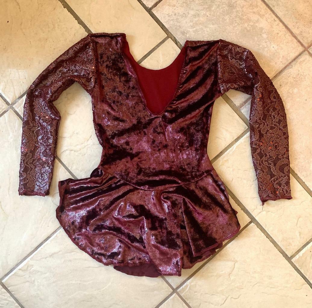 как выглядит NEW Girls BURGUNDY VELVET Glittery LACE Competition FIGURE ICE SKATING DRESS фото