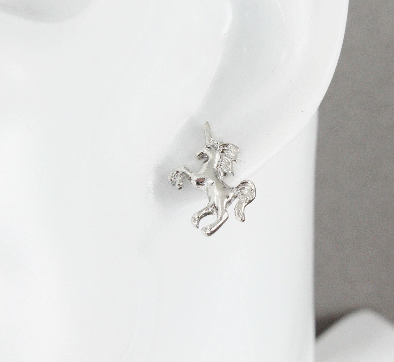 Silver unicorn earrings post stud unicorn horse horn mane lightweight 3/4 long