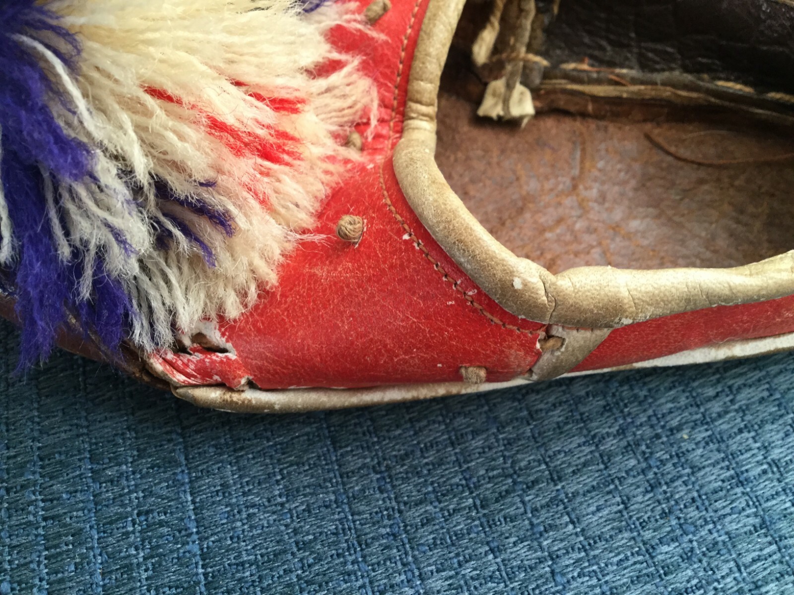как выглядит Vintage 1953 CHILDS RED LEATHER MOCCASINS with Blue and White Pom Pom  6" Long фото
