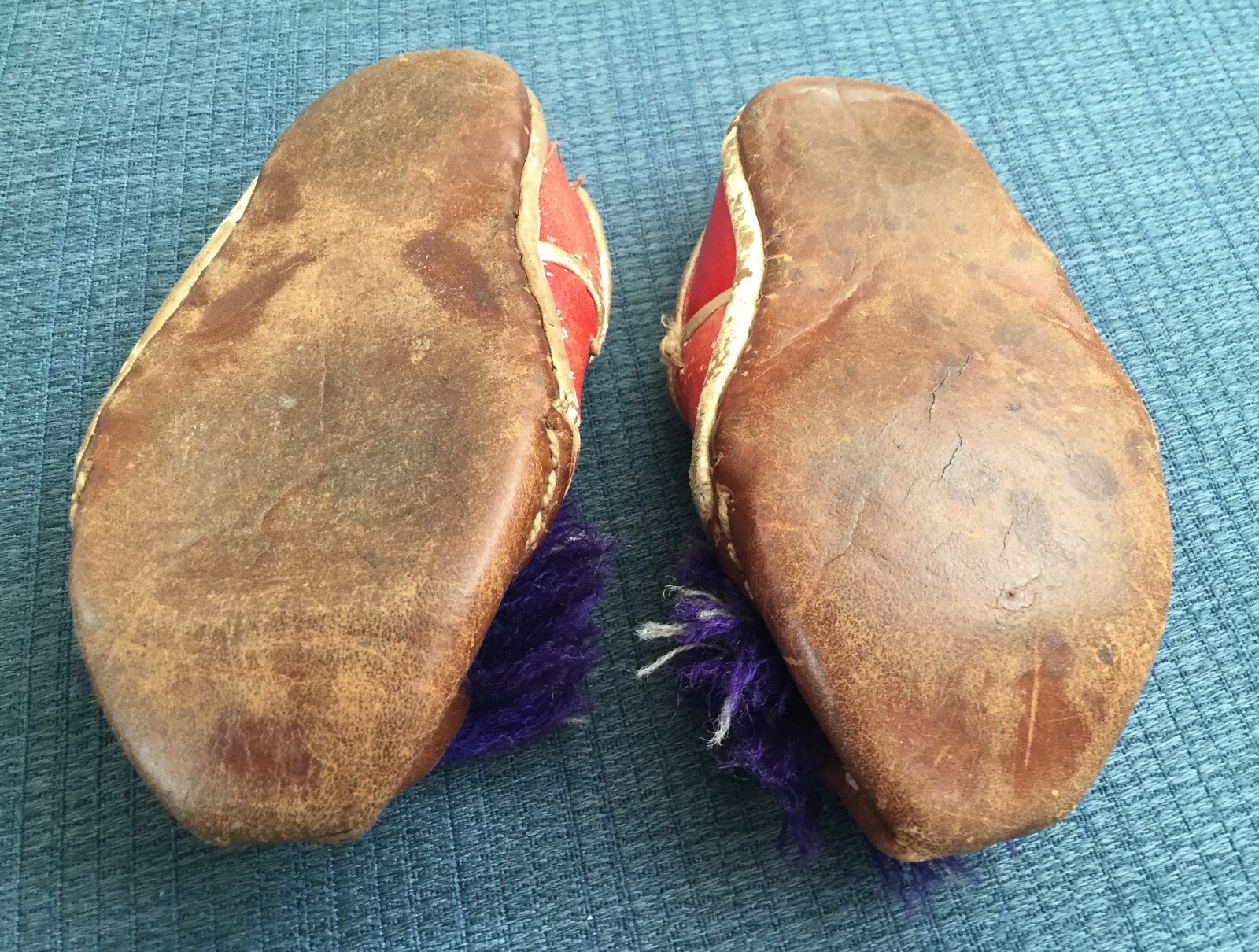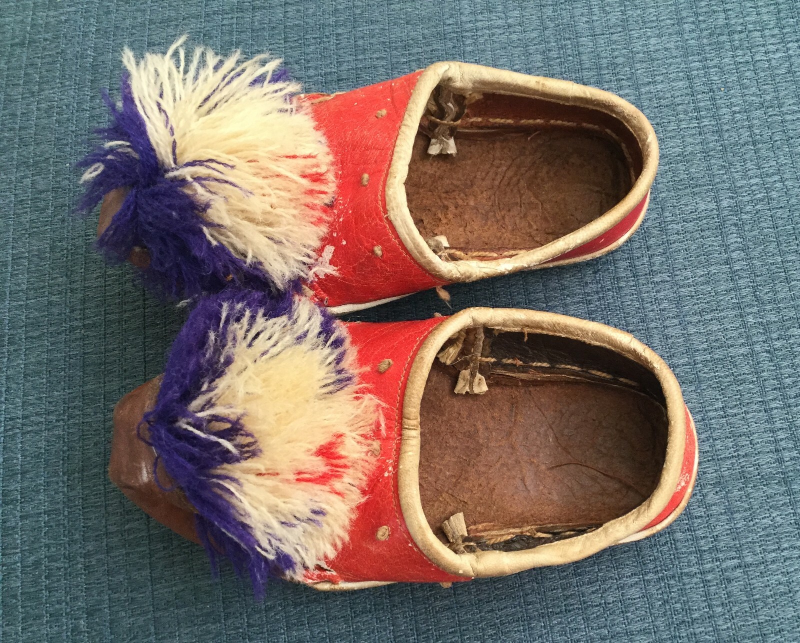 • Vintage 1953 CHILD'S RED LEATHER MOCCASINS with Blue and White Pom Pom 6" Long
