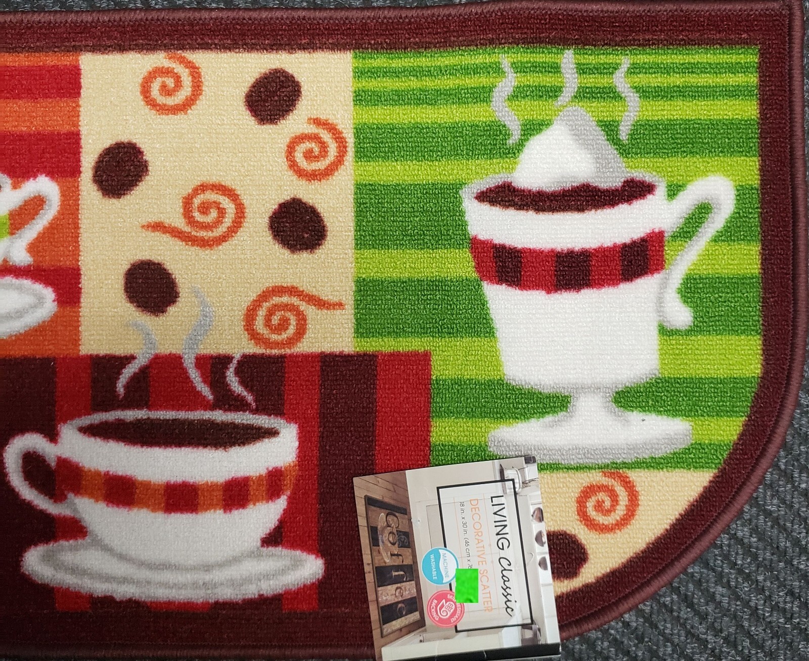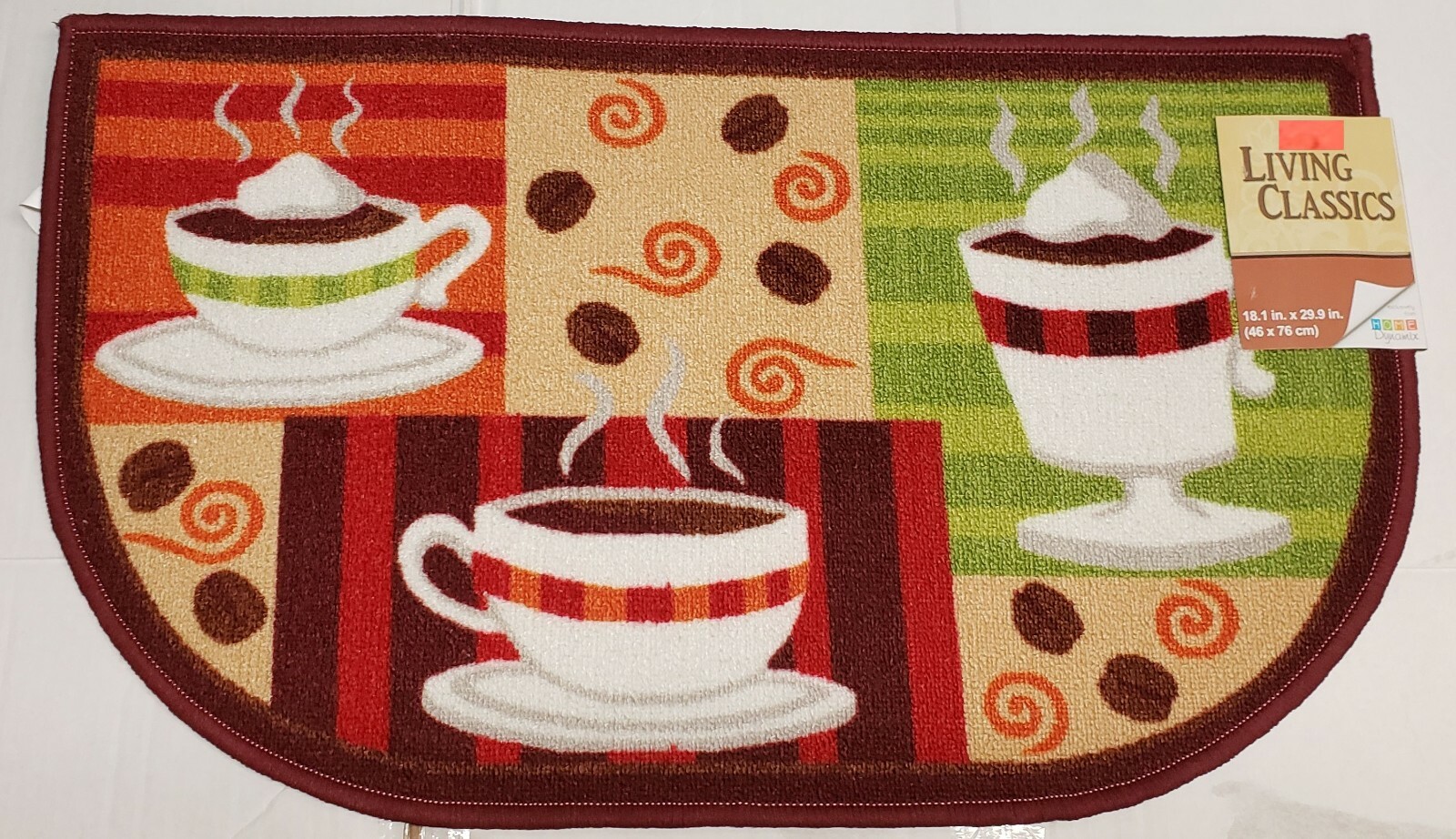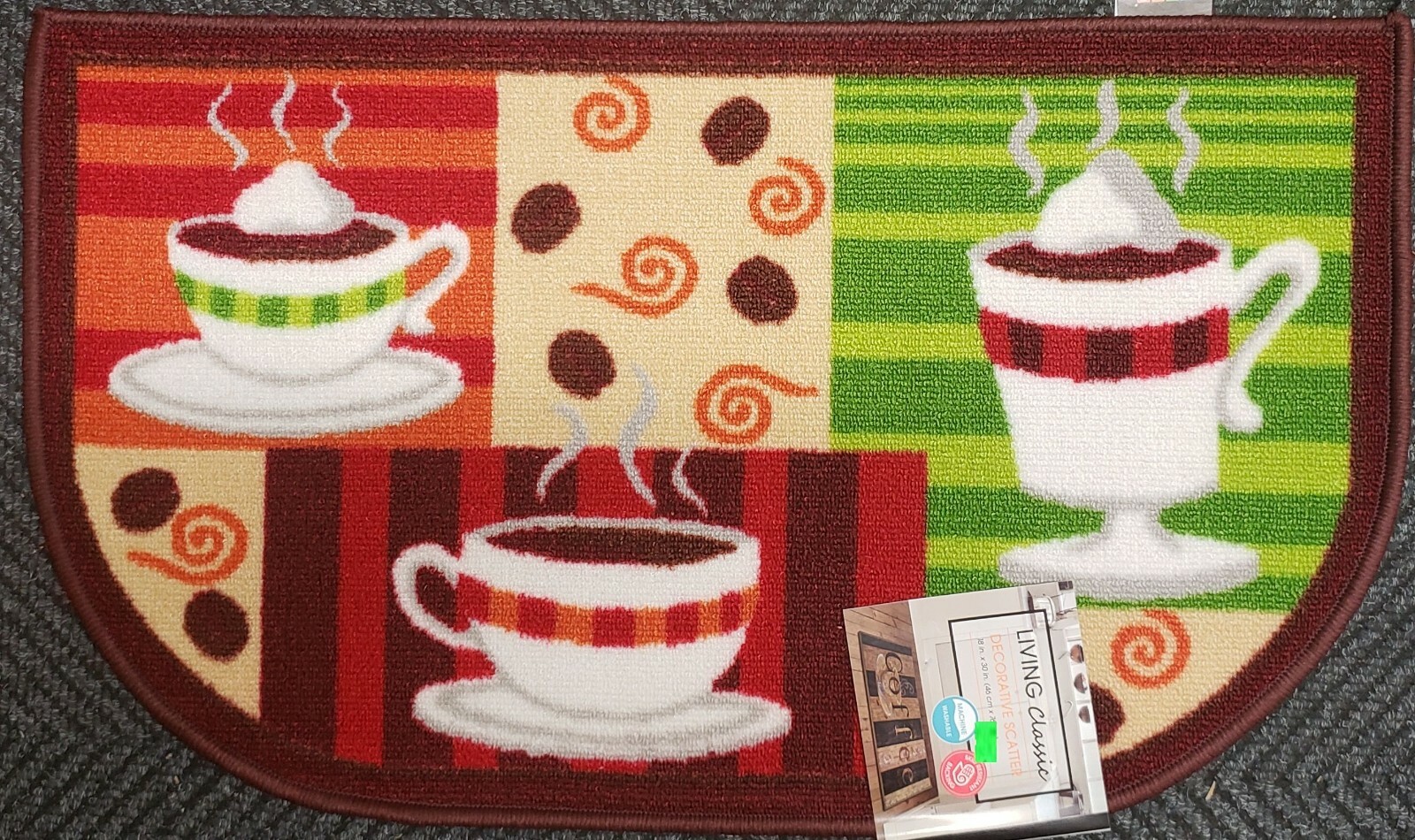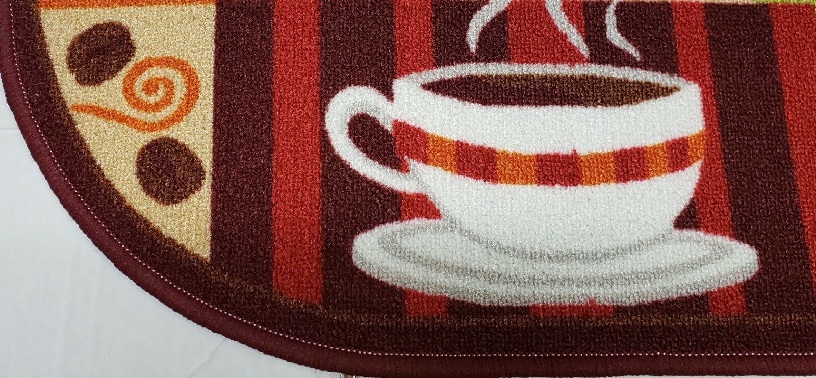 PRINTED NYLON RUG nonskid back 18x30 3 COFFEE CUPS BEANS, D SHAPE 1, HD