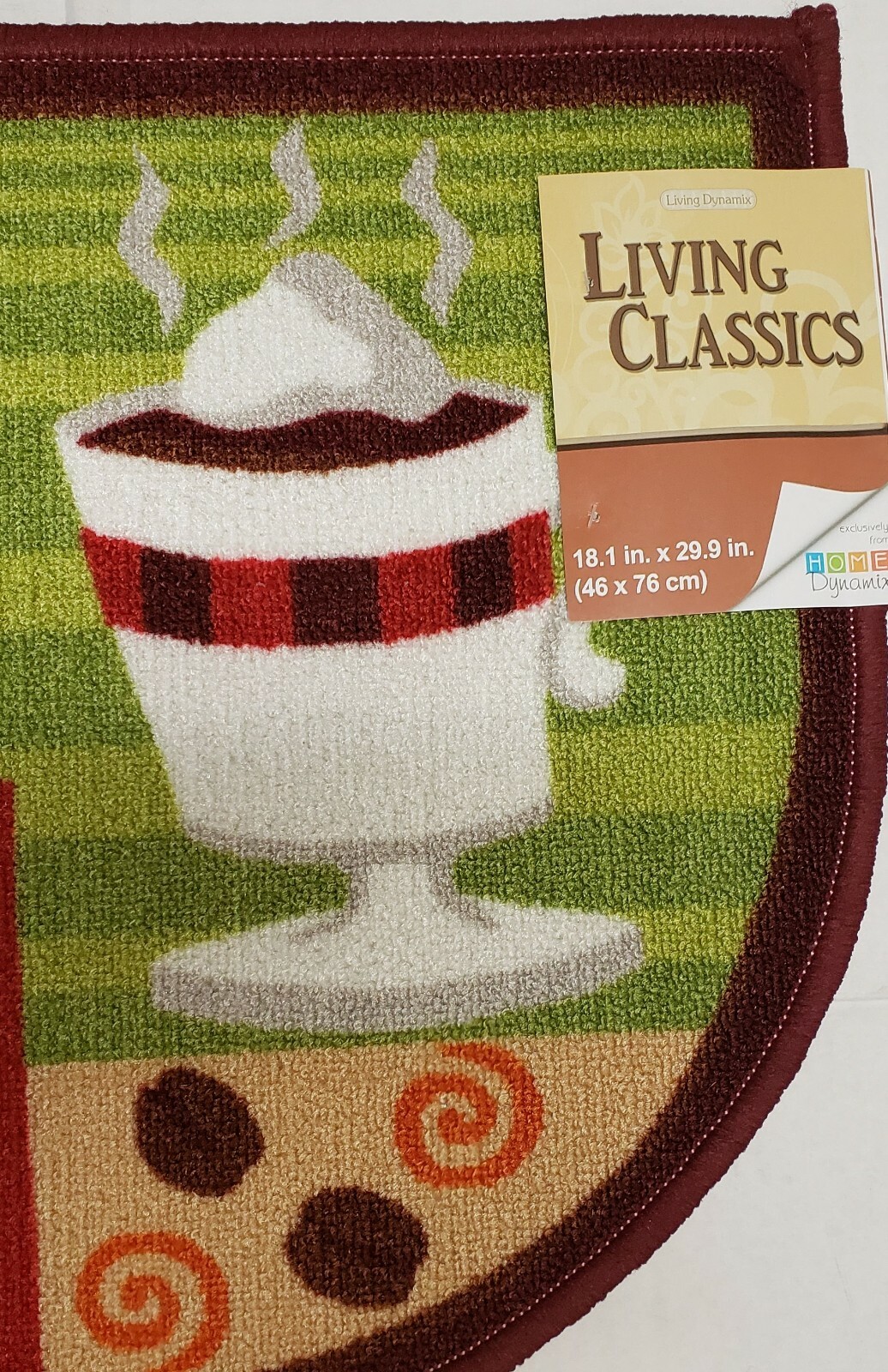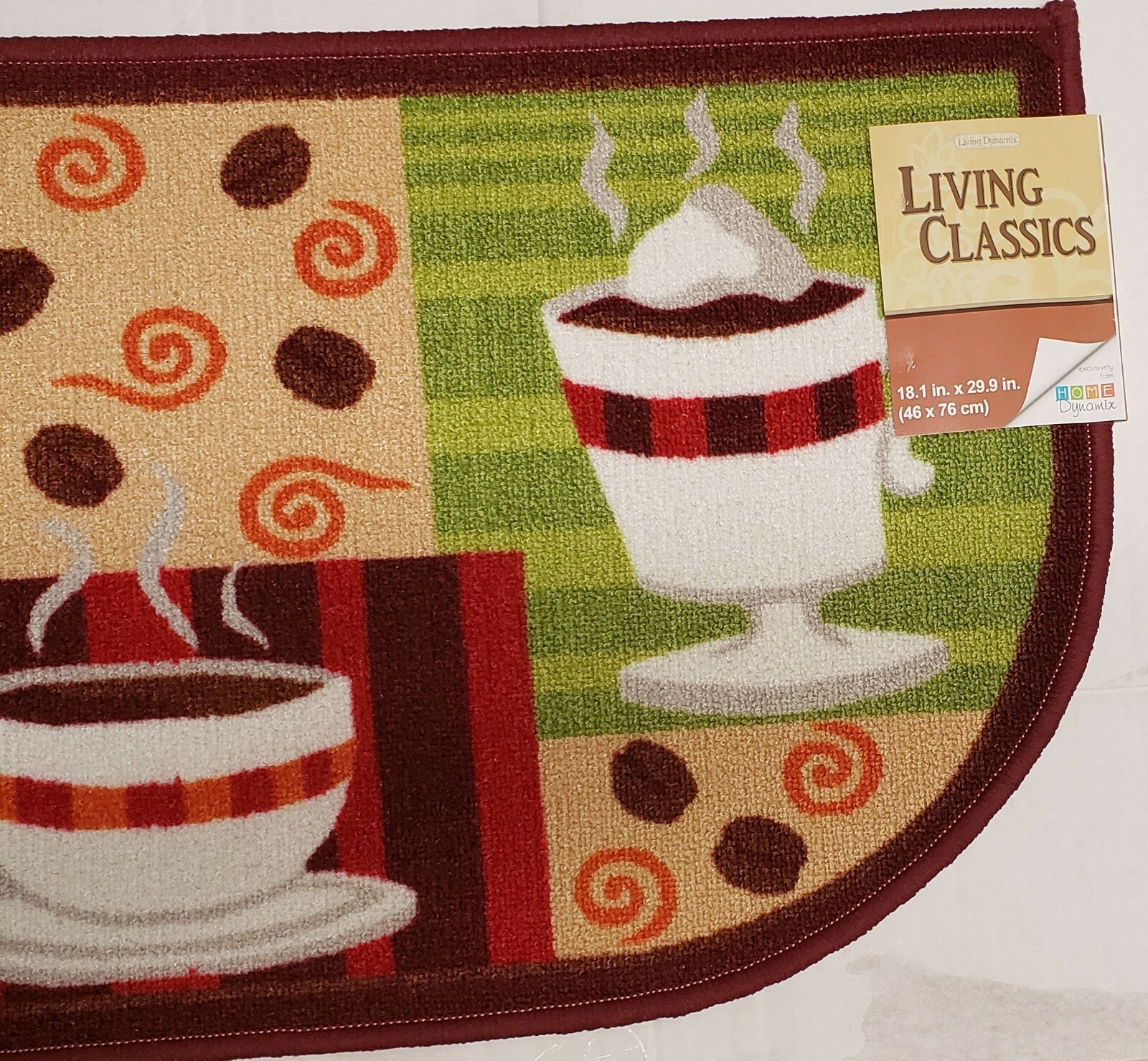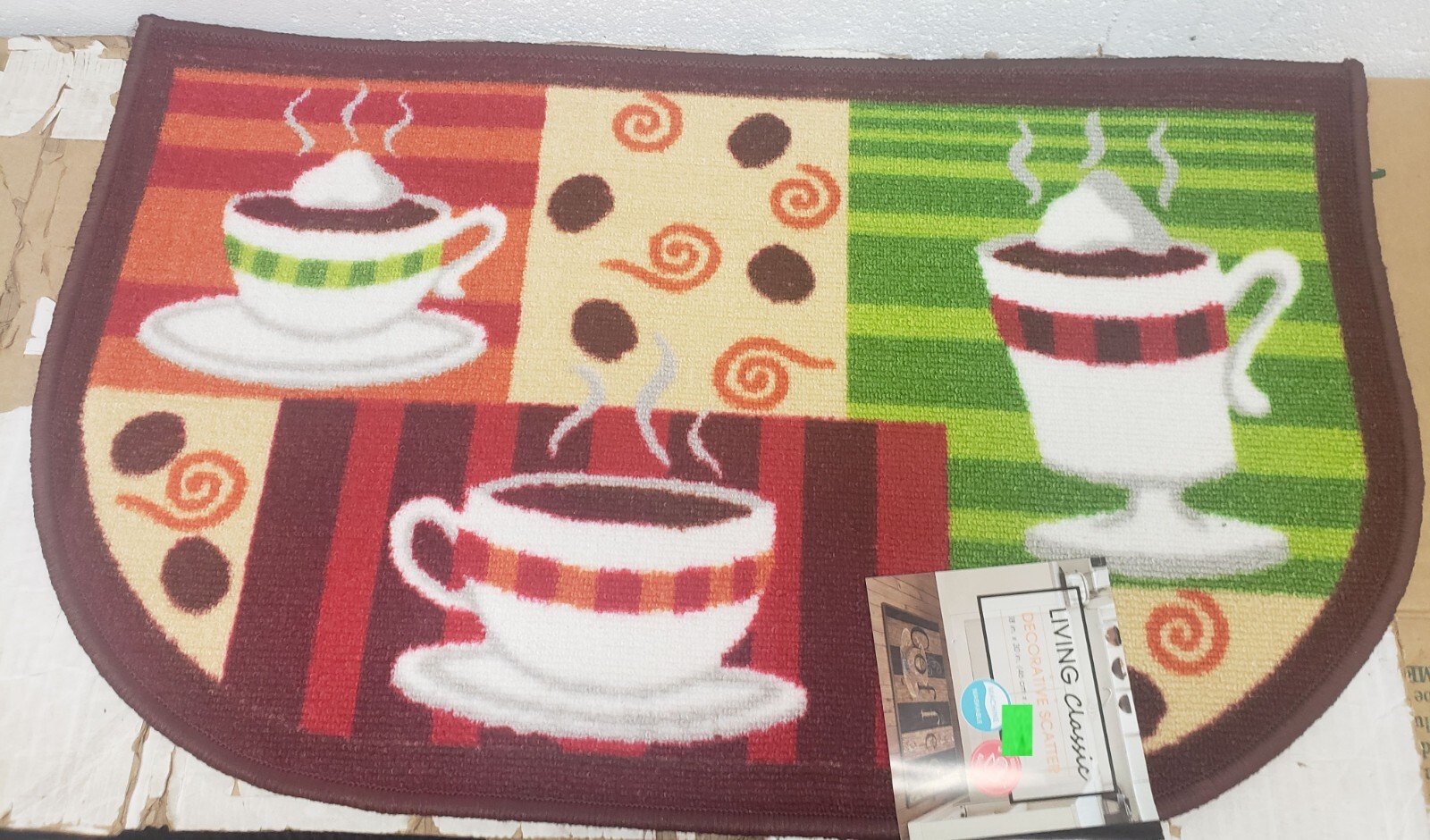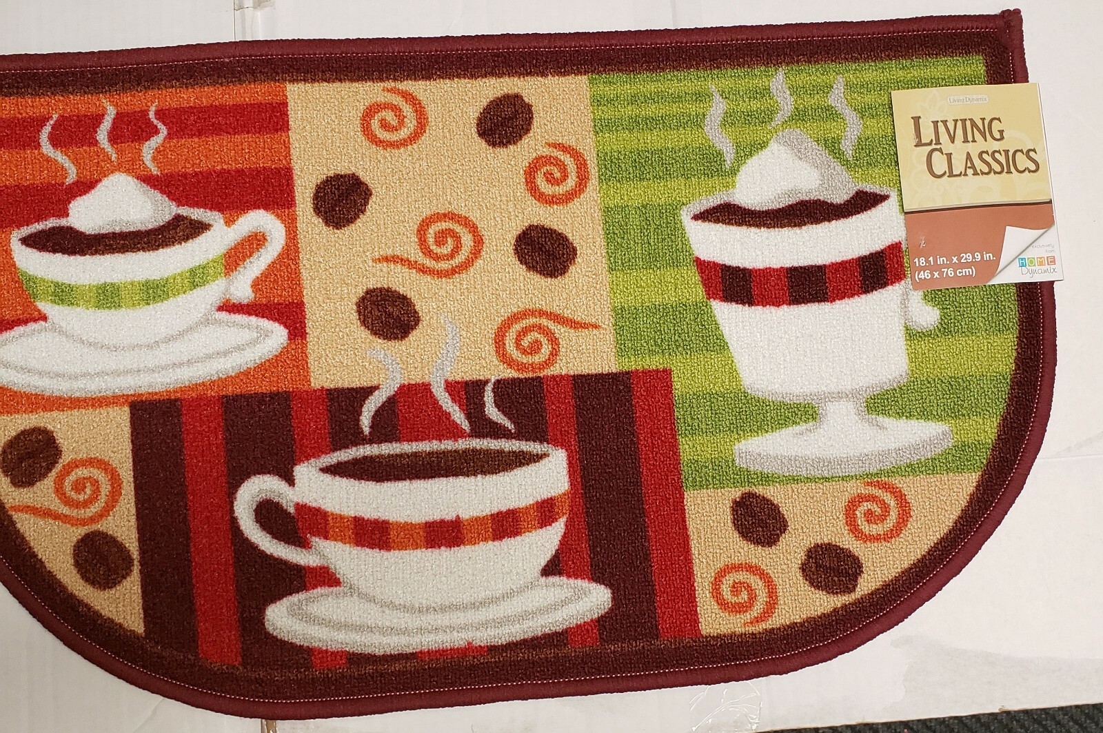 PRINTED NYLON RUG nonskid back 18x30 3 COFFEE CUPS BEANS, D SHAPE 1, HD