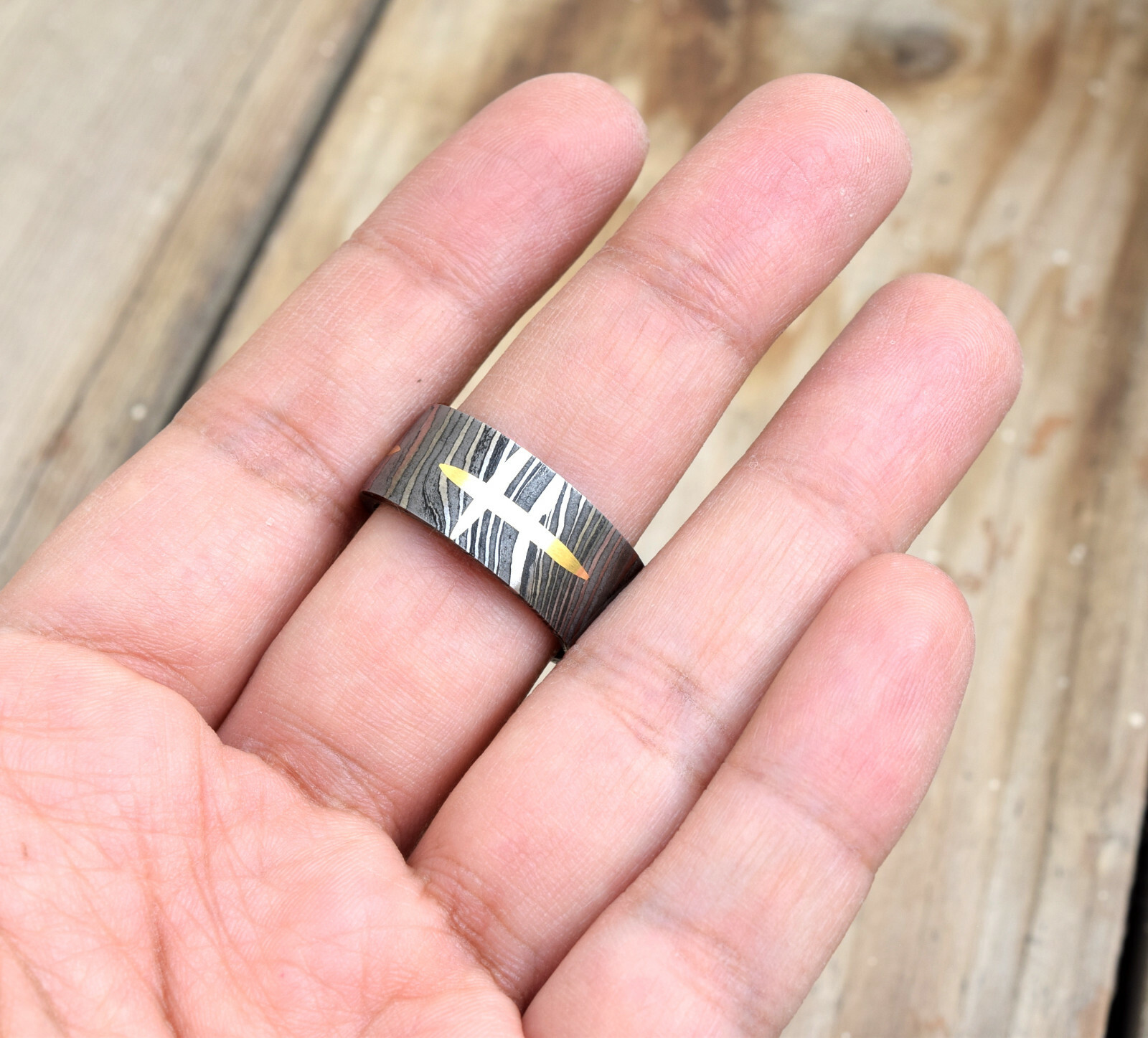как выглядит Brass Cross Damascus Steel Ring Custom Handmade Men Engagement Flat Wedding Band фото