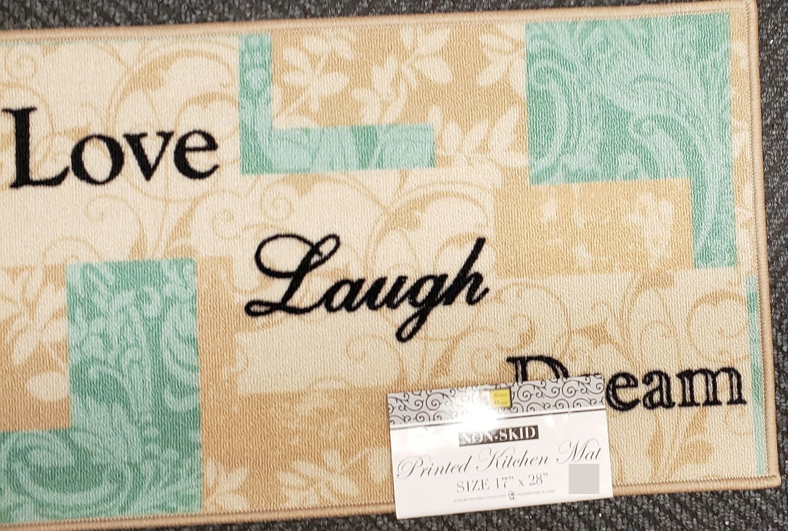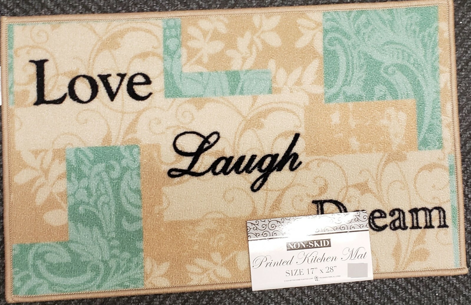KITCHEN PRINTED NYLON RUG nonskid 17x28 DREAM LAUGH LOVE,aqua green,rec,.BH