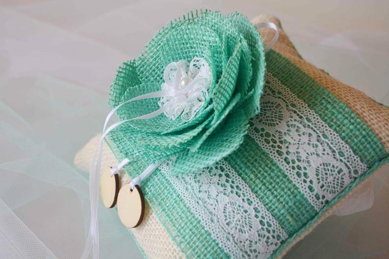 Rustic weddings Turquoise burlap lace ring bearer pillow, Handmade