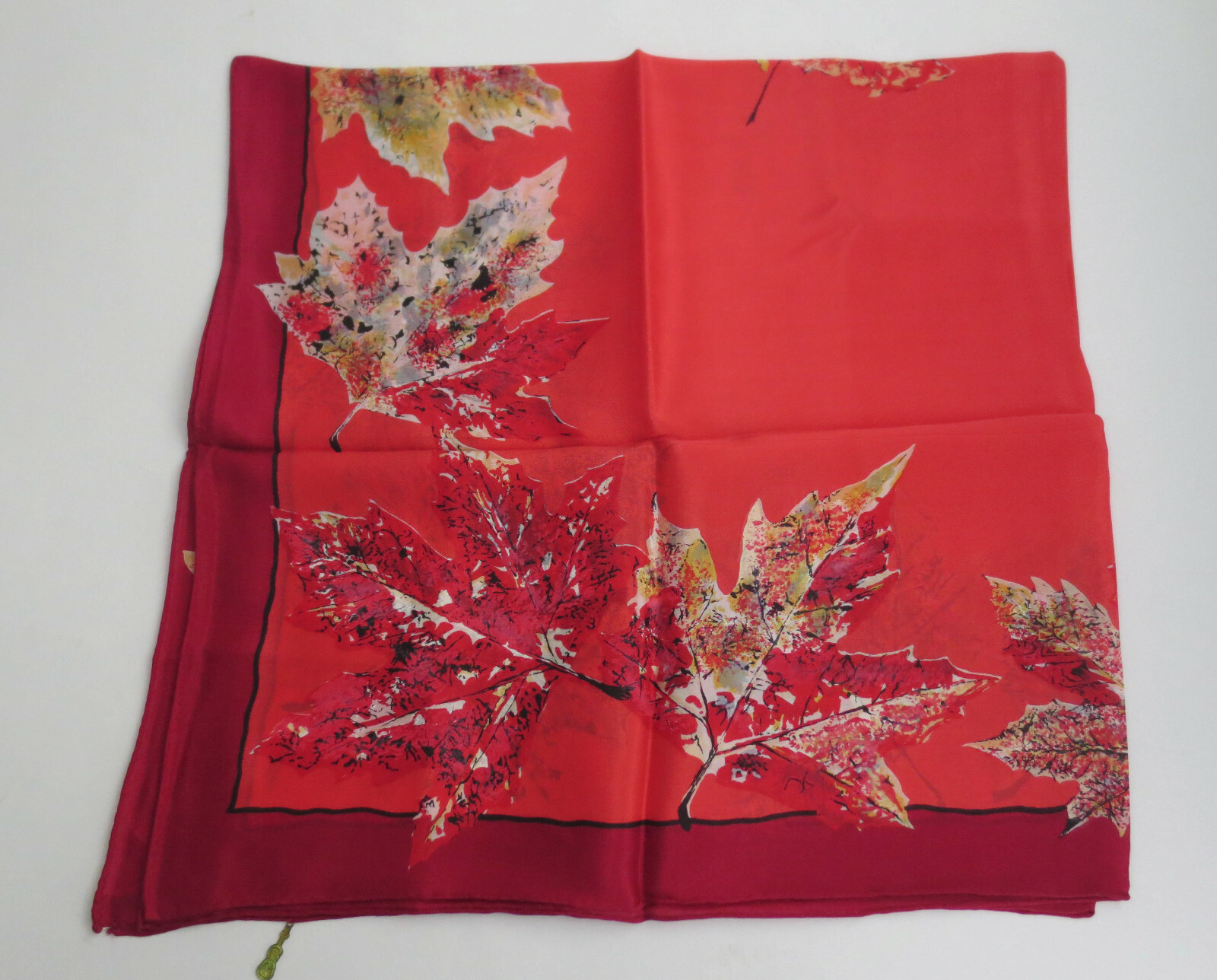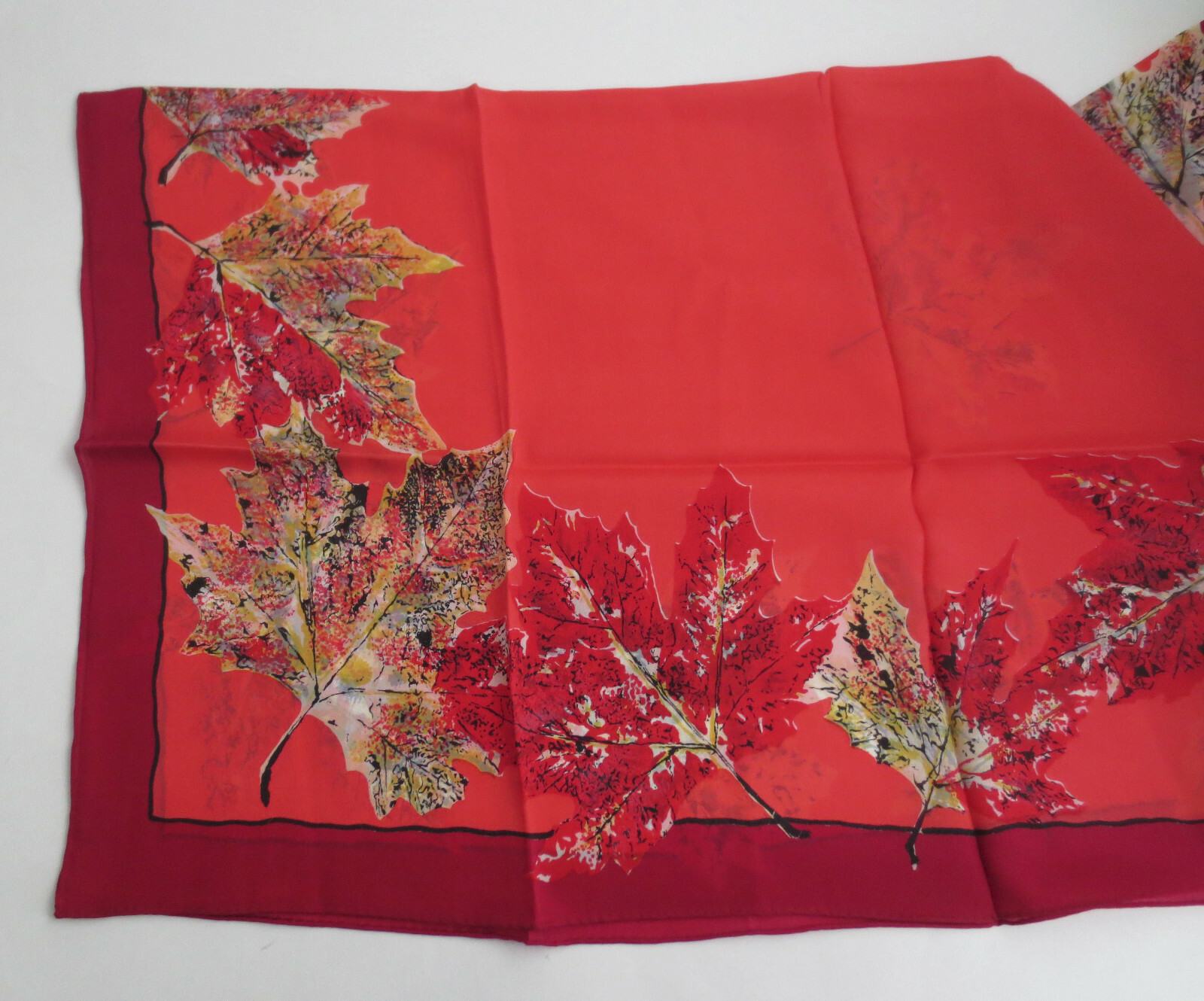 1950's Symphony Silk Scarf Red Fall Colors Maple Leaves w Orig Brass Violin Tag