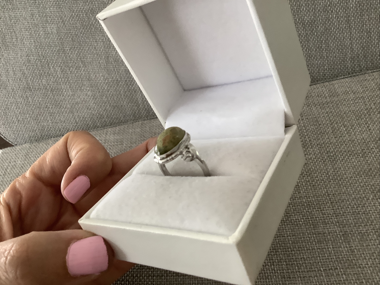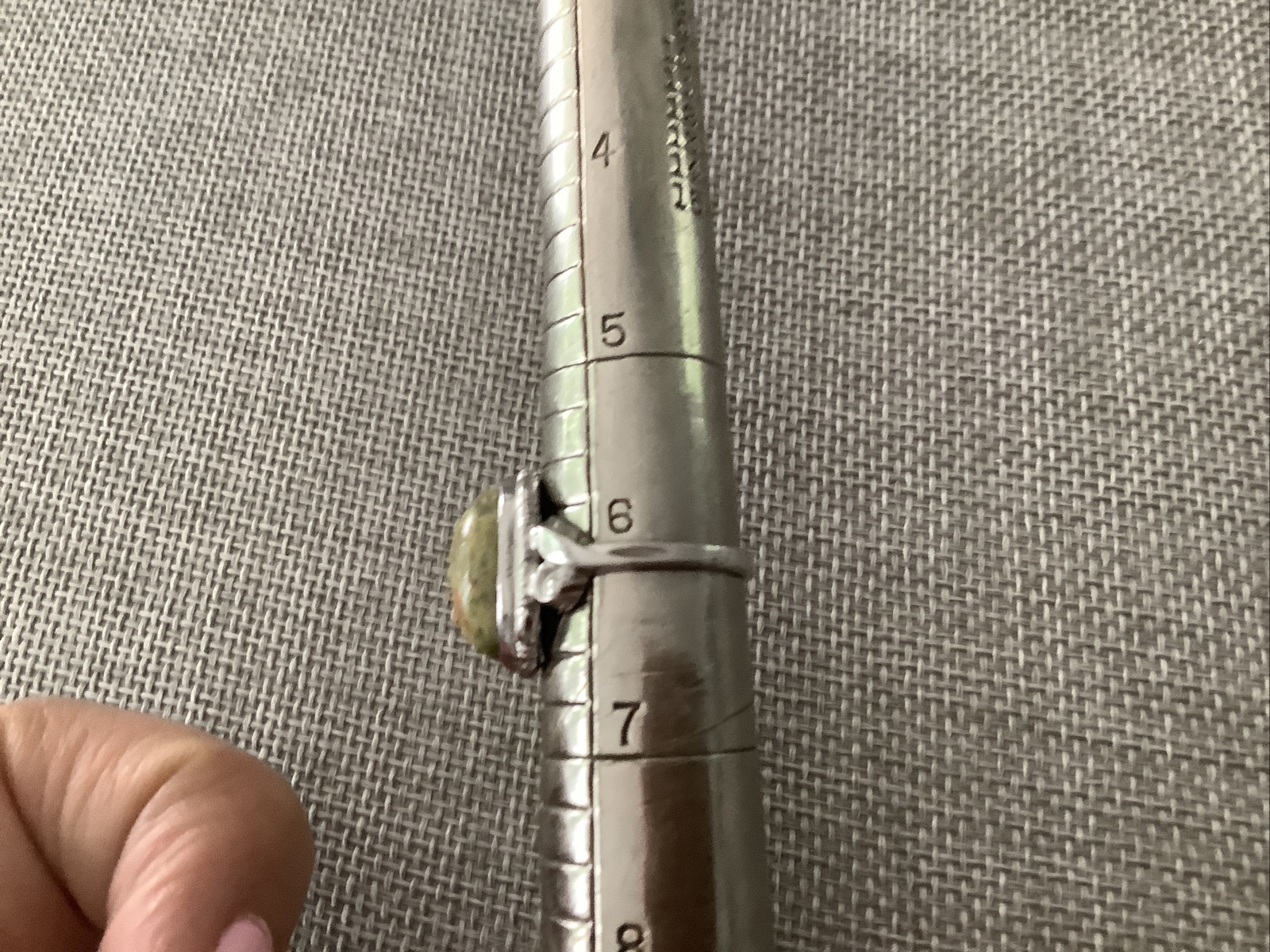 как выглядит Sterling Silver Oval Cabochon Multi Toned Green Gemstone Speckled Ring Sz 6 фото