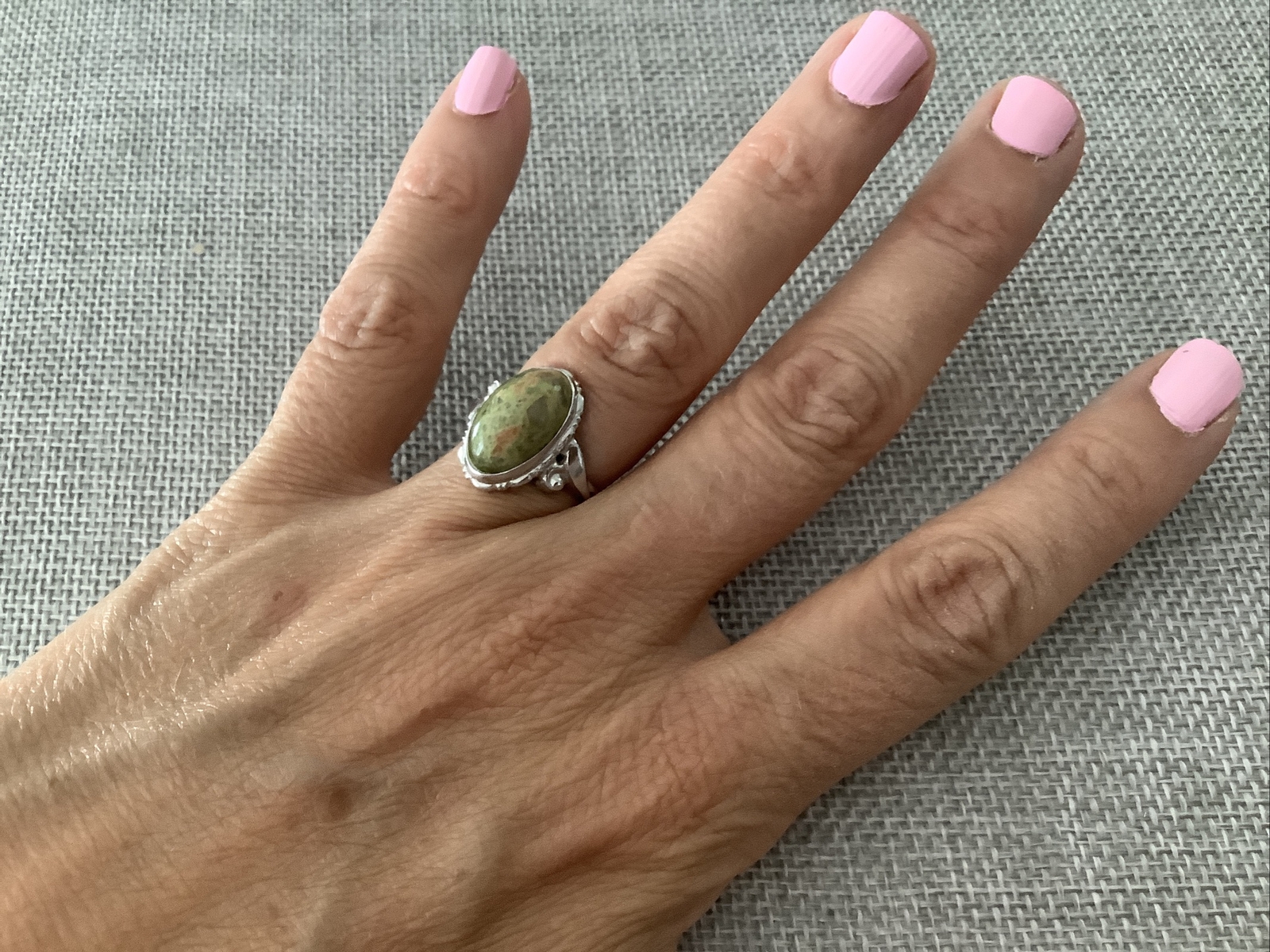 Sterling Silver Oval Cabochon Multi Toned Green Gemstone Speckled Ring Sz 6