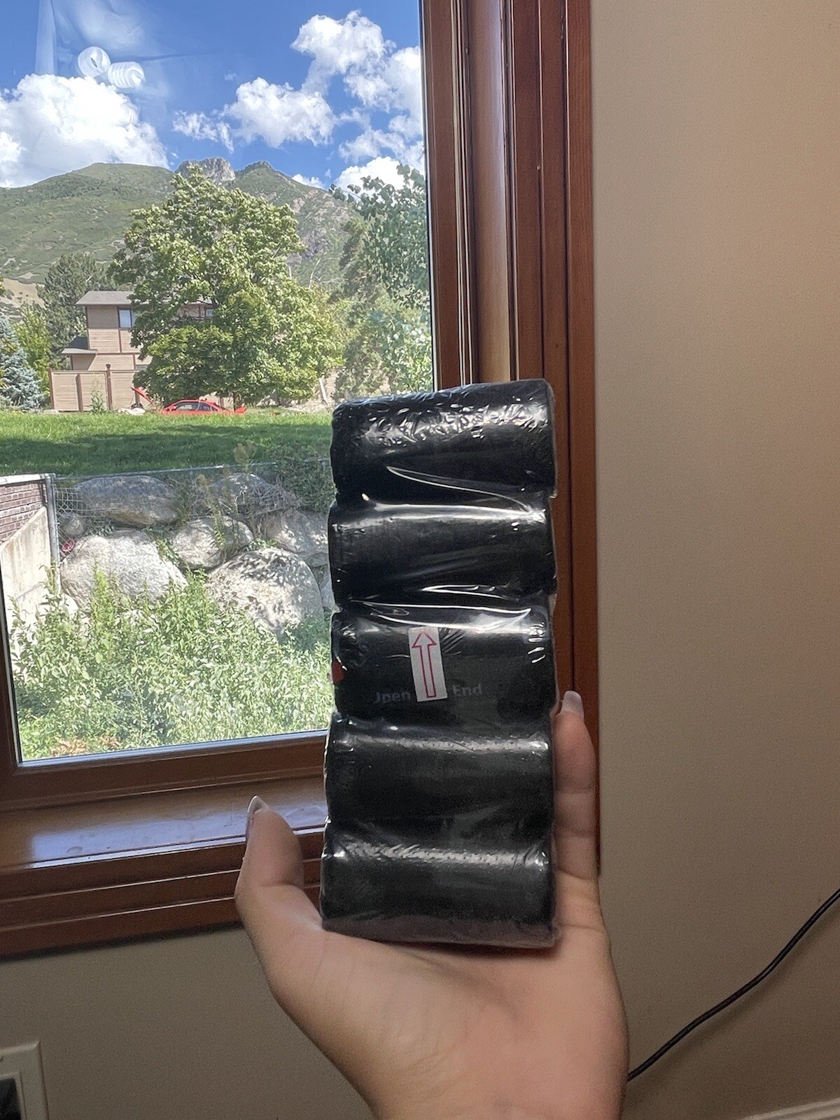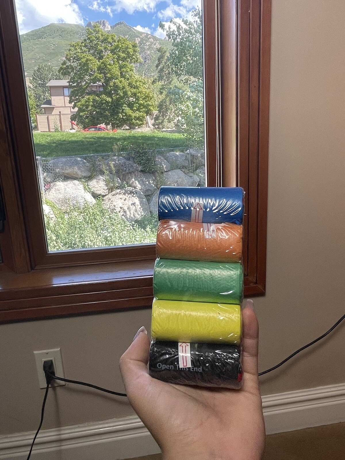 как выглядит COLORFUL/BLACK DOG LEASH ROLLS PET POOP BAGS DOG WASTE BAGS PACKS OF 5 Rolls фото