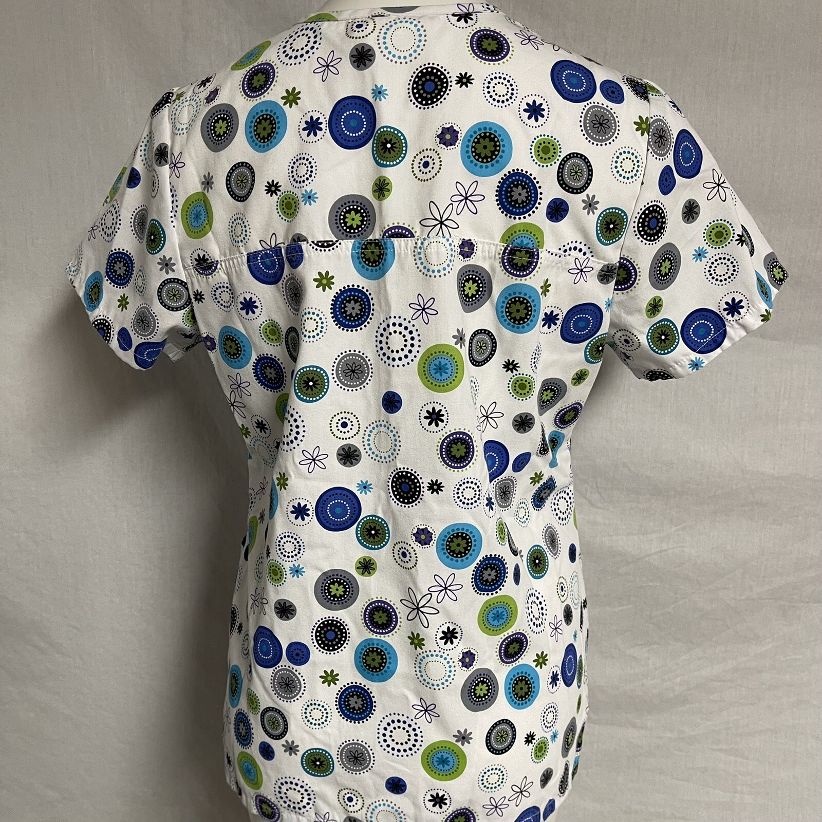 как выглядит Nurse Scrub Mock Wrap Top White Blue Green Purple Flowers Circles Pockets XS фото
