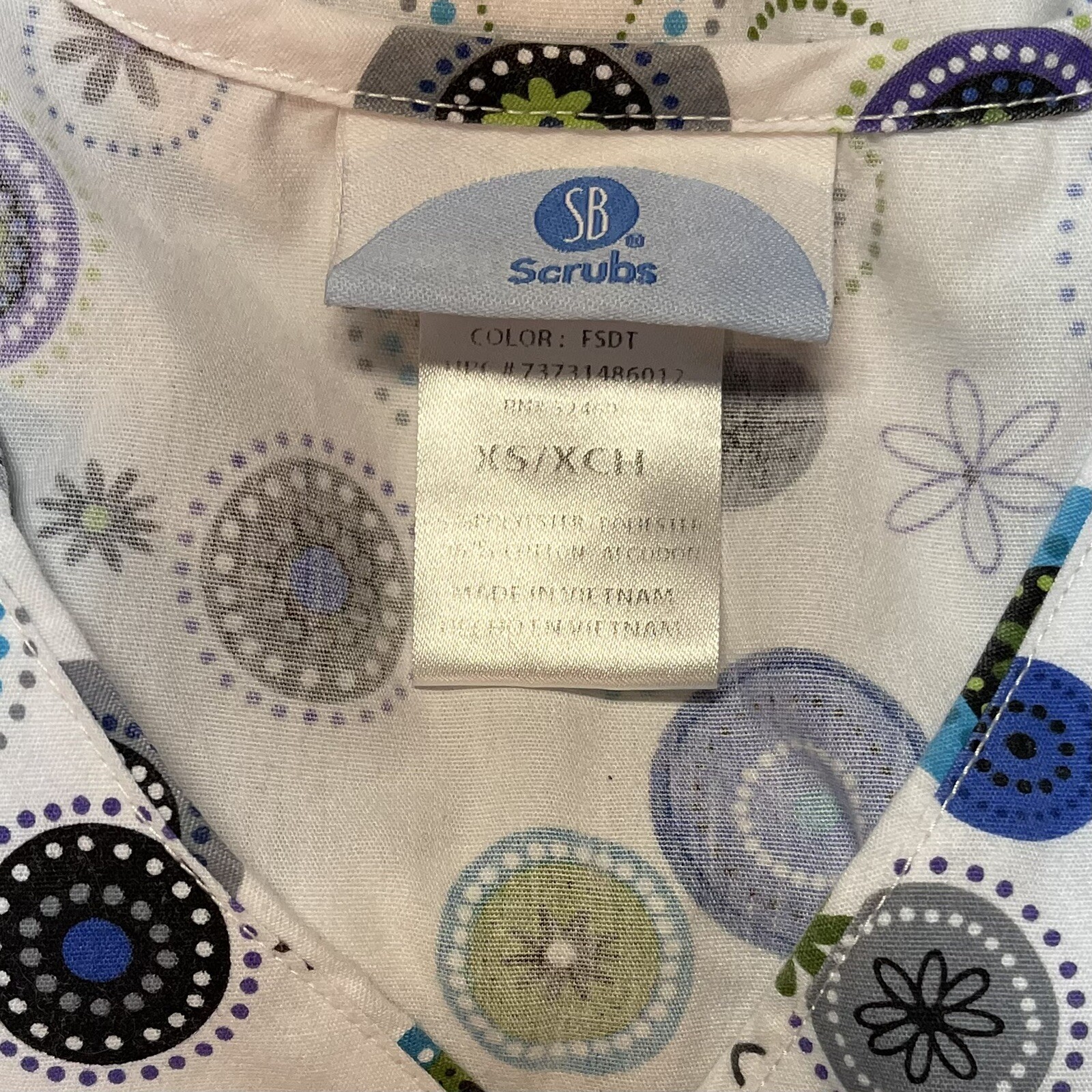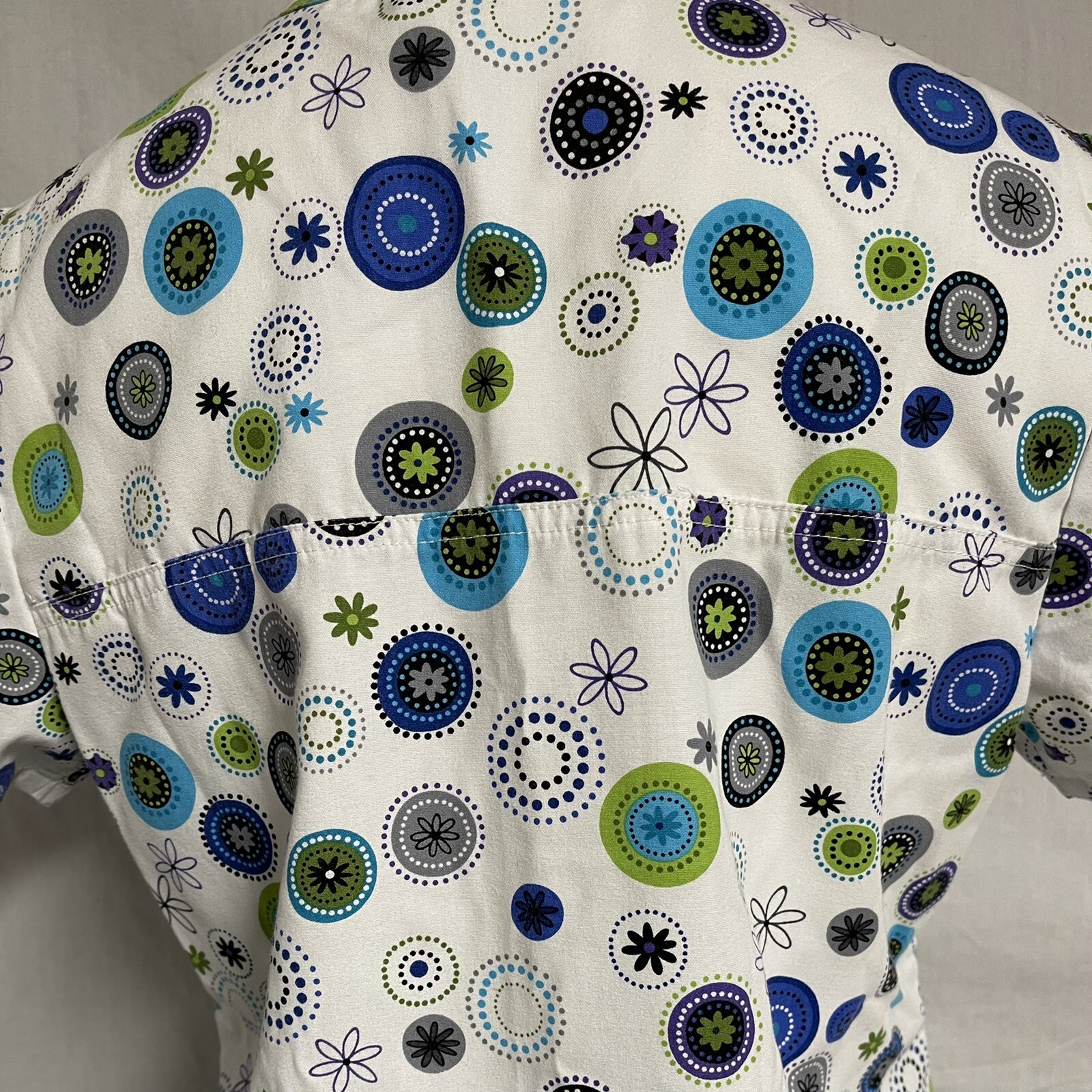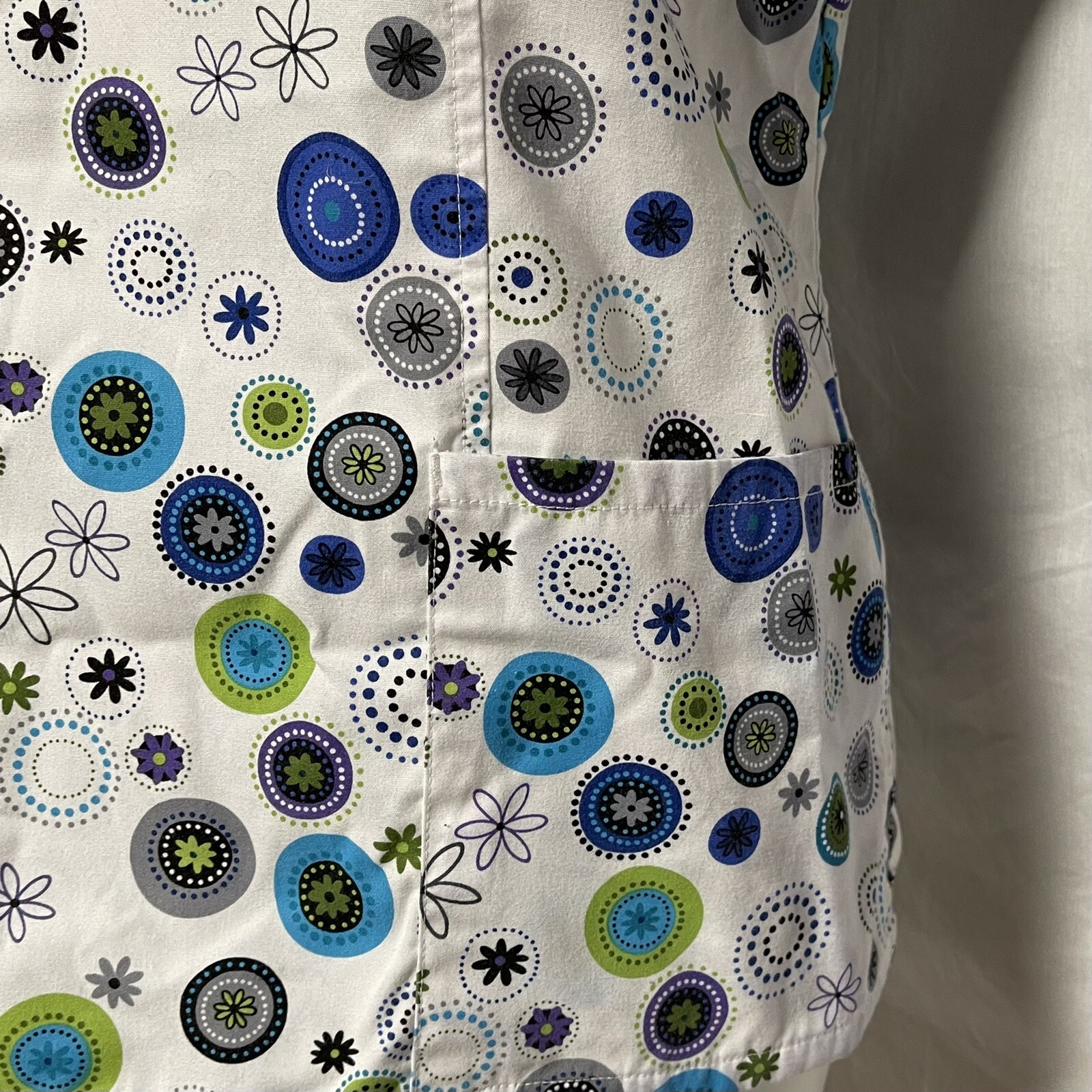 Nurse Scrub Mock Wrap Top White Blue Green Purple Flowers Circles Pockets XS