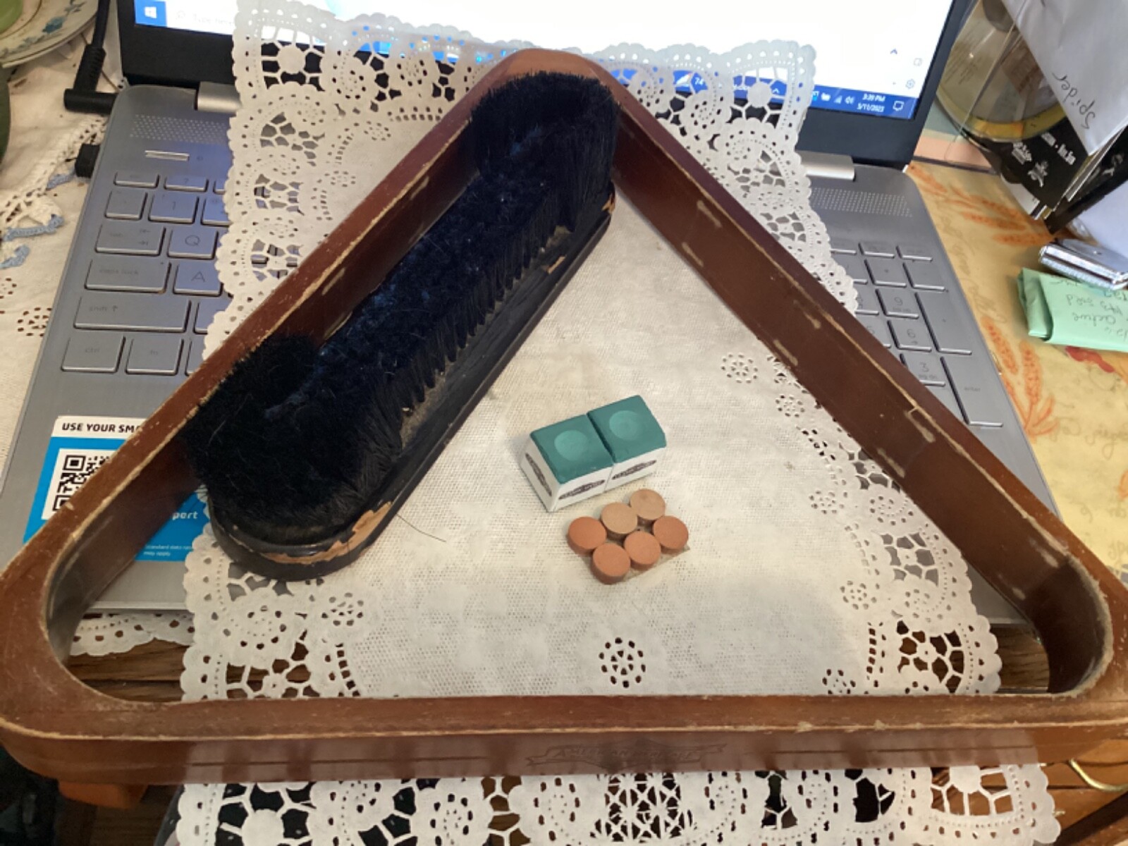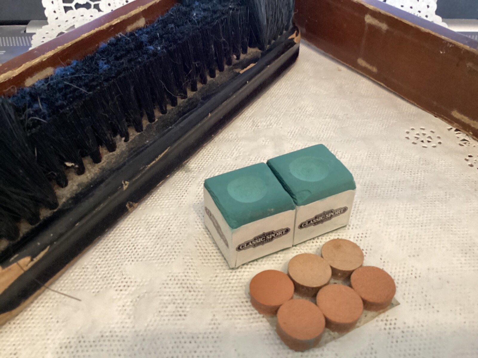 American Heritage Pool Table Supplies Lot chalks, tips, rack,brush for billiards