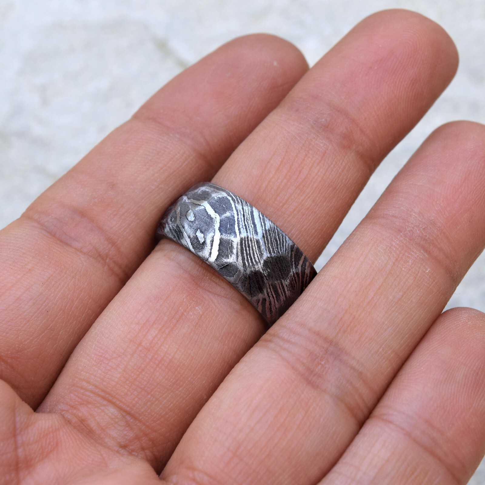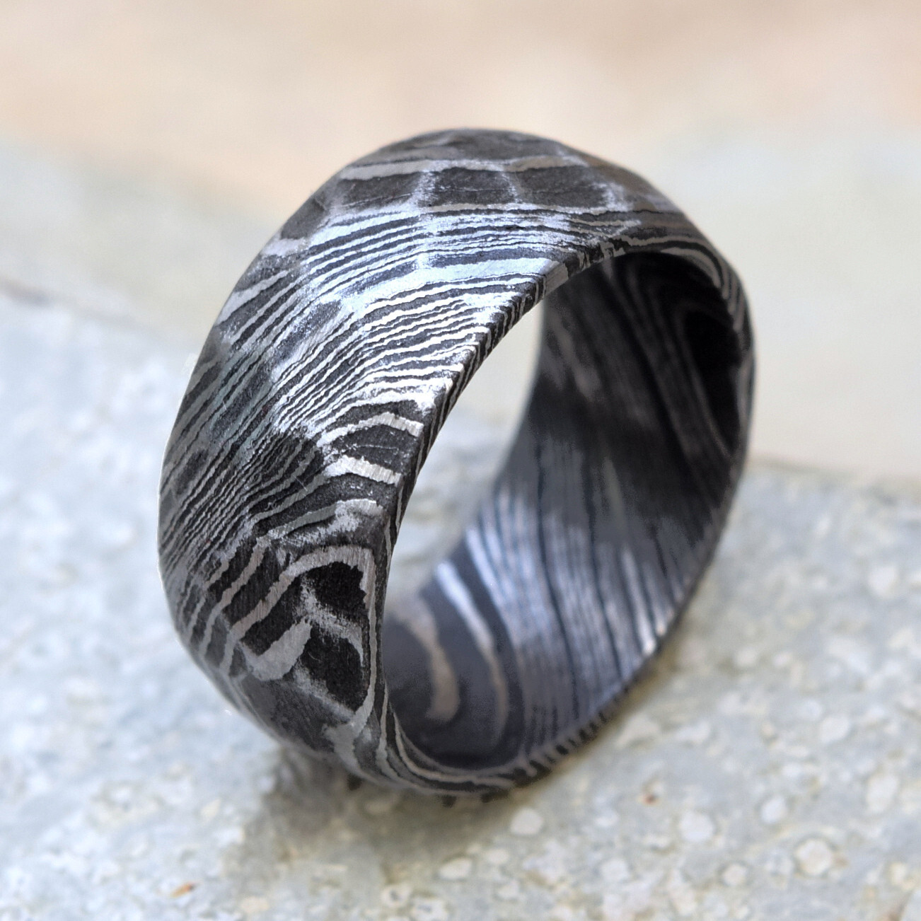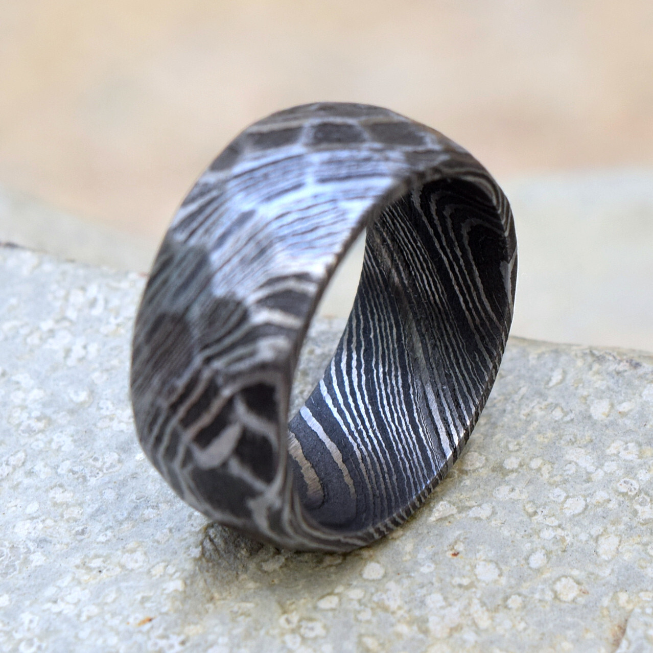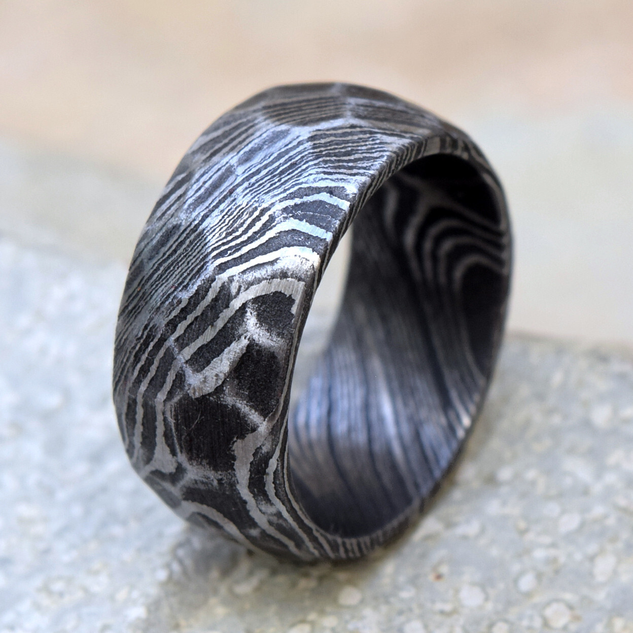 как выглядит SIZE 10 10mm Wide Raw Damascus Steel Rugged Hammered Ring Hand Forged Band Mens фото