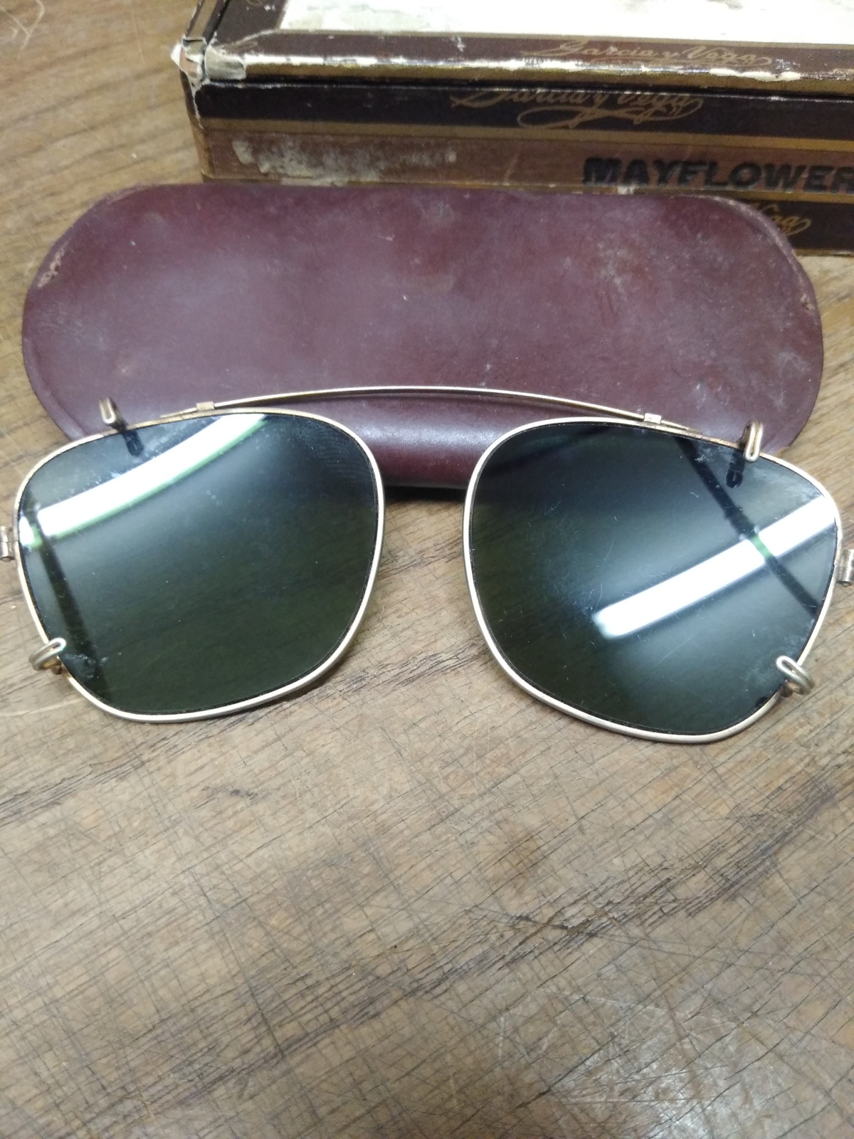 как выглядит Vtg Clip On Sun Glasses Glass Lens Gold Frame 1950s-1960s Leather Case фото