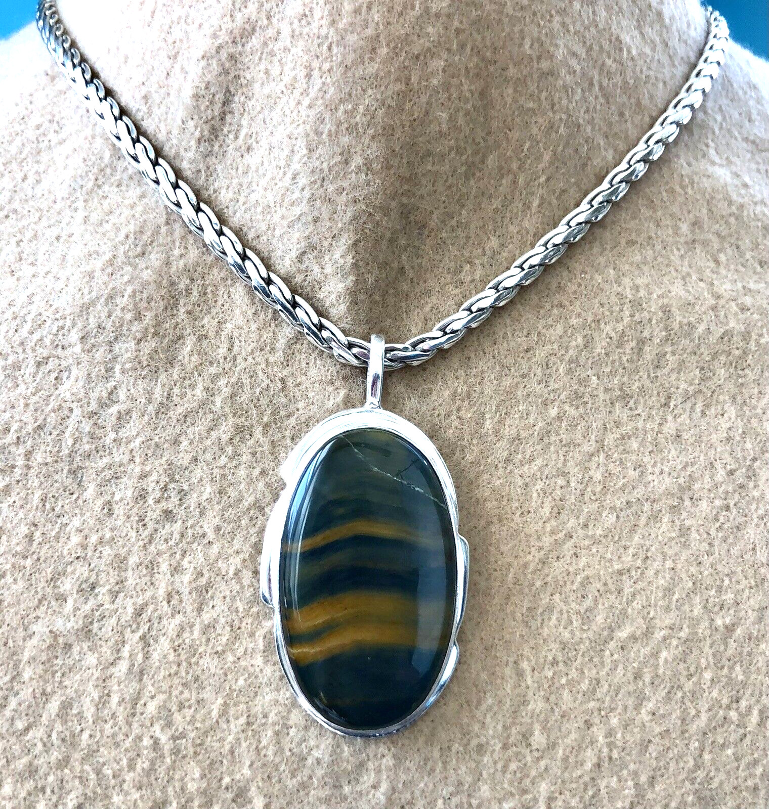 как выглядит LARGE 2 1/2" Black Tigers Eye Pendant Modern Oval .925 Sterling Silver фото