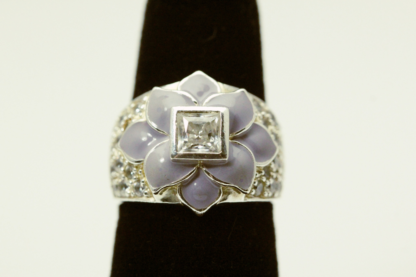 925 Sterling Silver Size 6 Purple Flower Dome Ring W/CZ Accents 7.4 G RIN8607