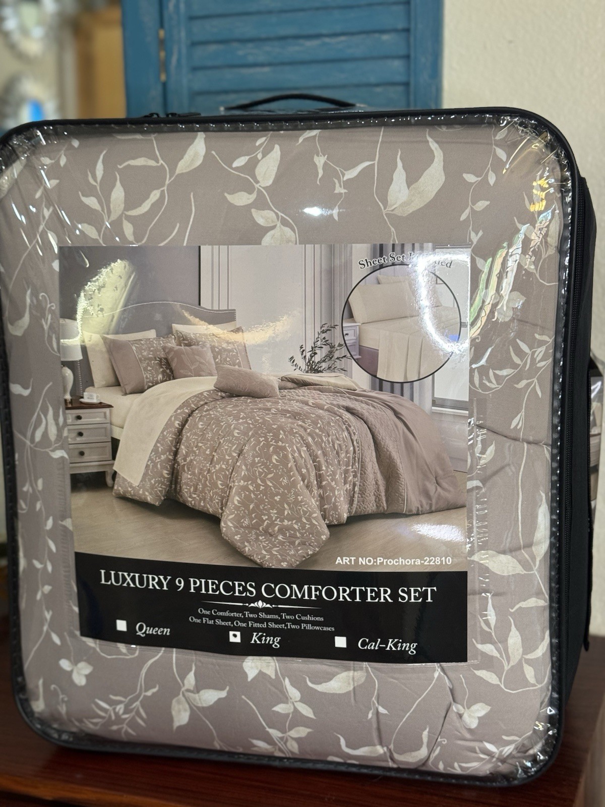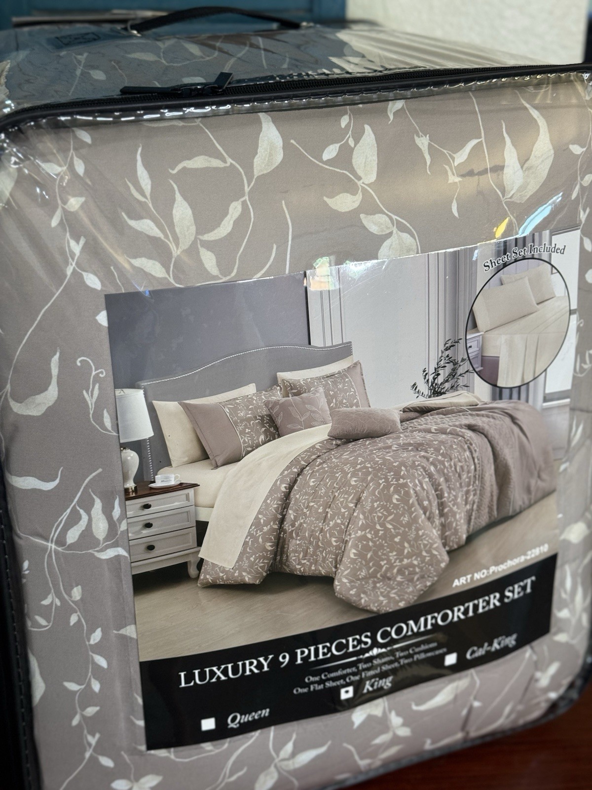 New Botanical Floral 9 Piece queen size Comforter Set with sheet set Light Khaki