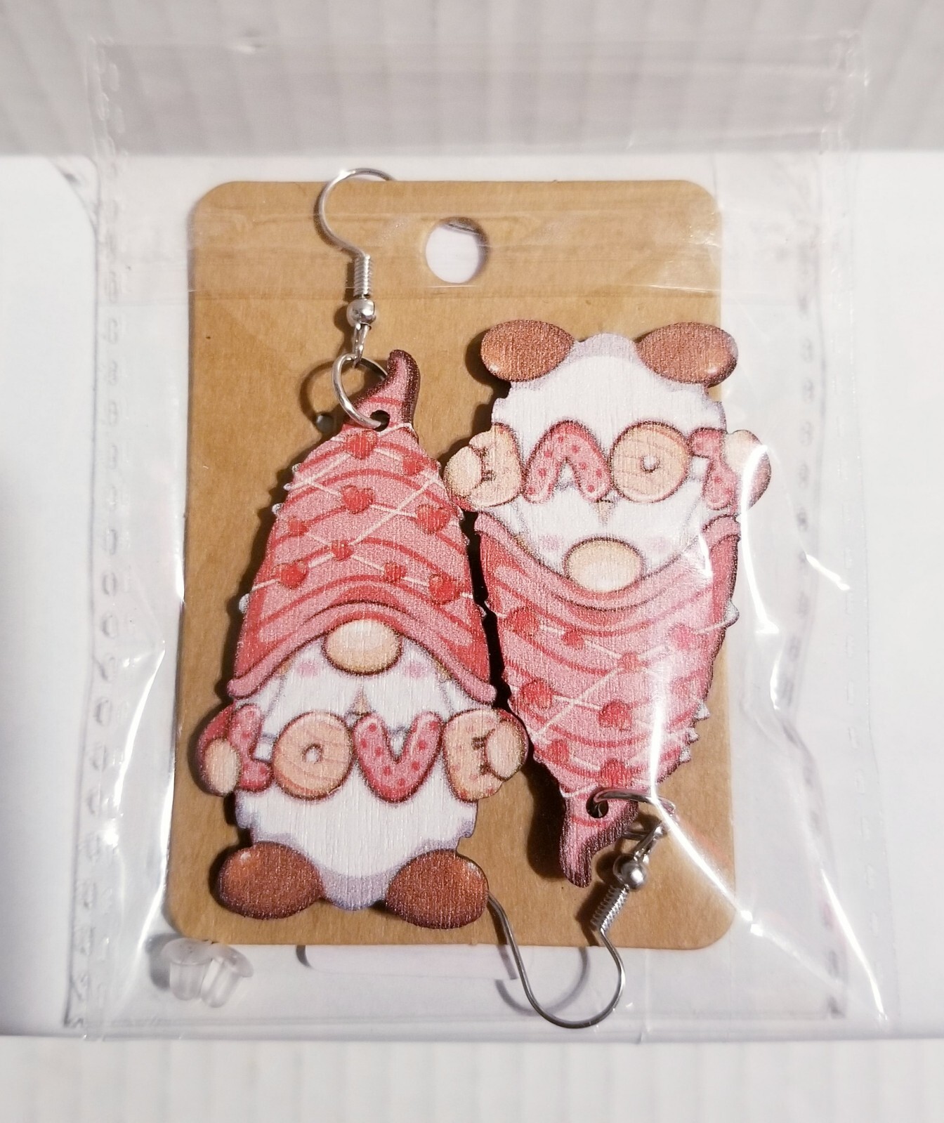 как выглядит Happy Valentines Day LOVE Gnome Wood Double Sided Earrings 2" X 1 1/4" New фото