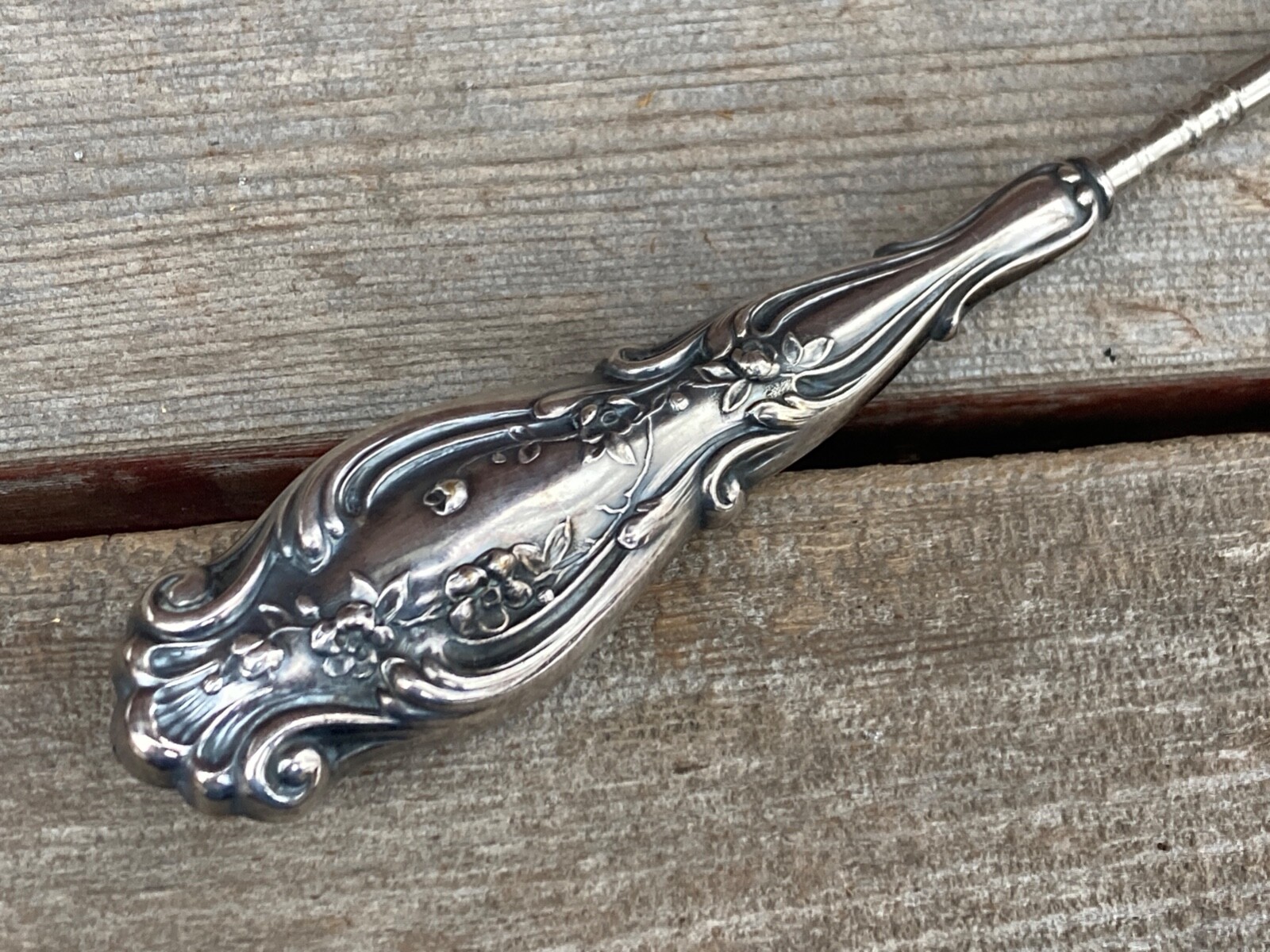 VTG ART NOUVEAU REPOUSSE SEWING TOOL BUTTON HOOK FLOWERS