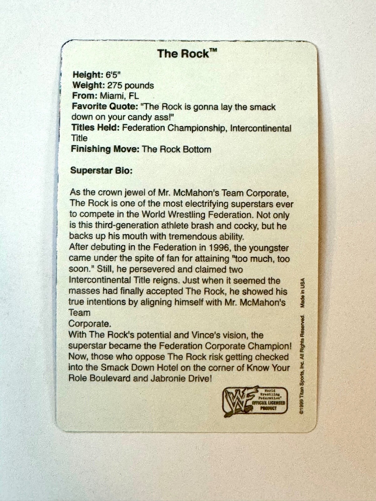 Player/Athlete: Mick Foley, Mankind, The Rock, Duane Johnson, Goldberg, Kane, Al Snow, HHH, Triple H, Edge, Hardy Boyz, Trish Stratus, Rikishi, New Age Outlaws, DX, Sting, Lex Luger, NWO, WCW