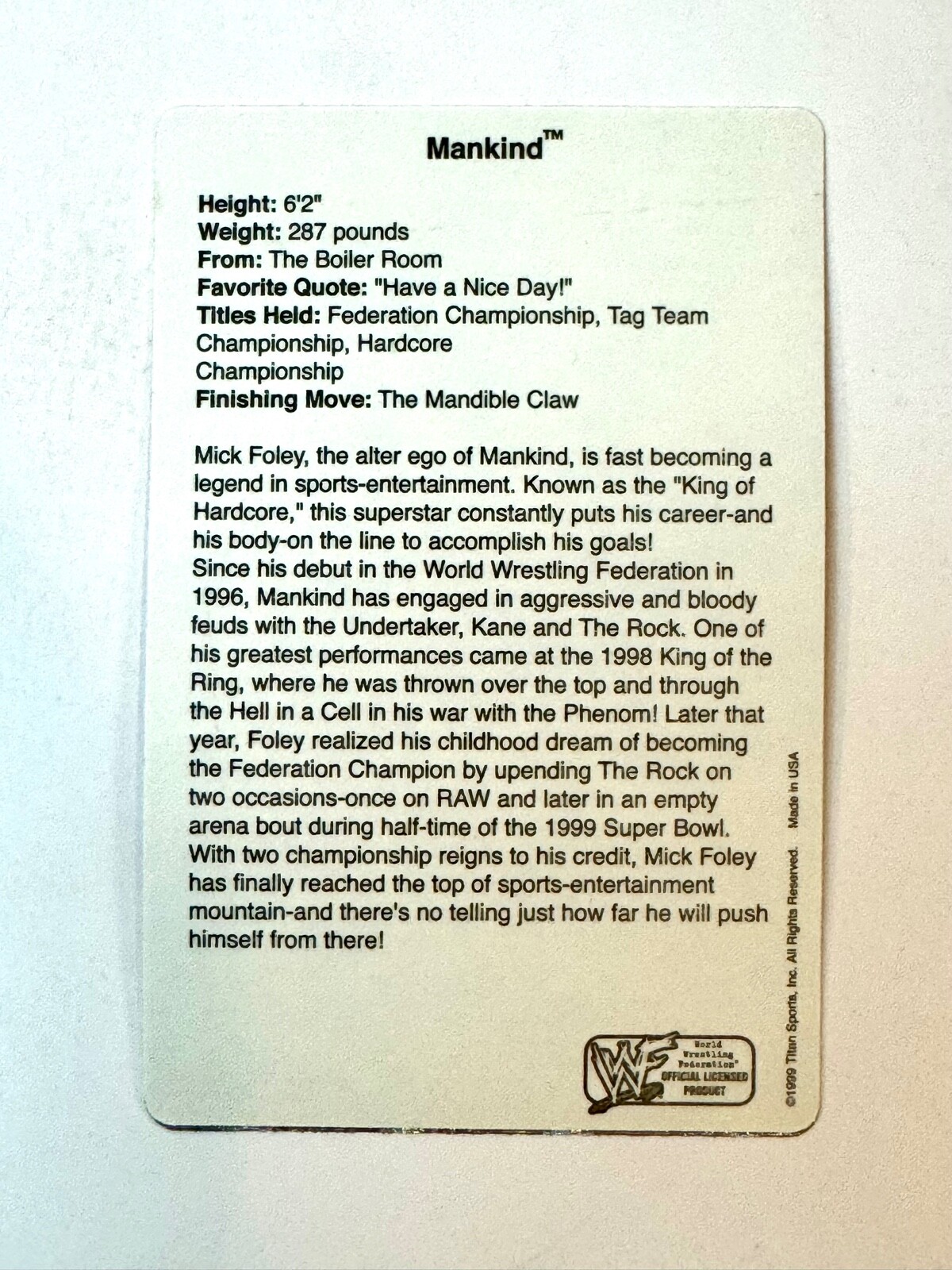 Player/Athlete: Mick Foley, Mankind, The Rock, Goldberg, Kane, Al Snow, HHH, Triple H, Edge, Hardy Boyz, Trish Stratus, Rikishi, New Age Outlaws, DX, Sting, Lex Luger, NWO, WCW, Kat, Undertaker, Dudley Boyz, Road Dogg, Ken Shamrock, Giant, Big Show, DDP, Diamond Dallas Page, Four Horseman, Stone Cold, Steve Austin