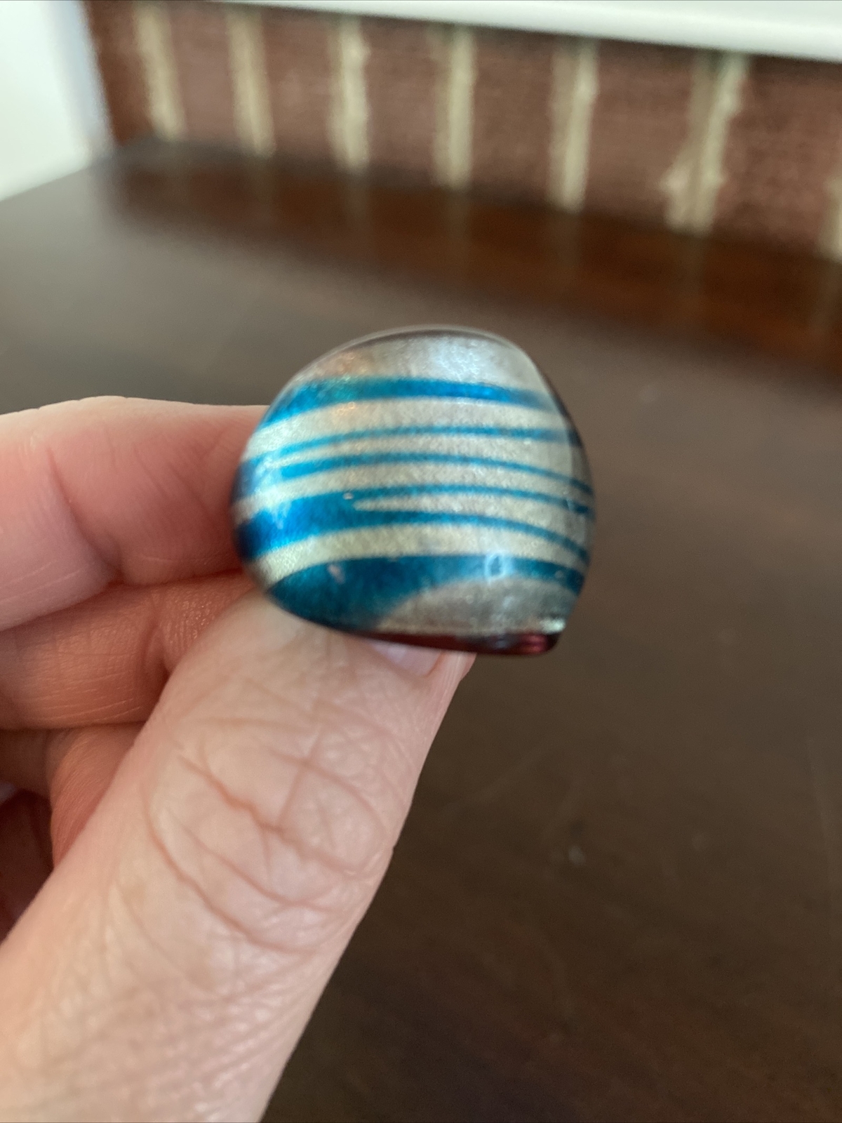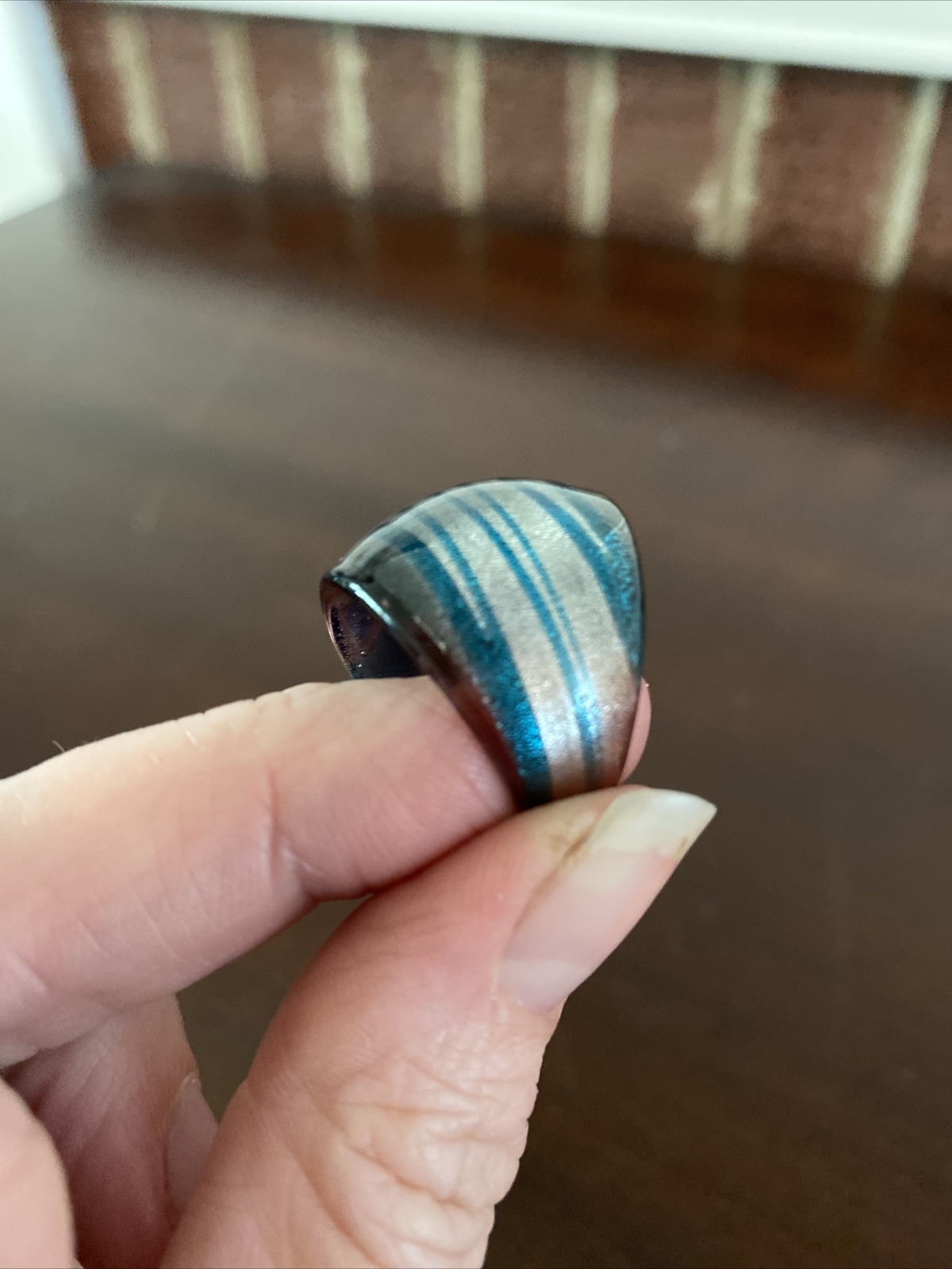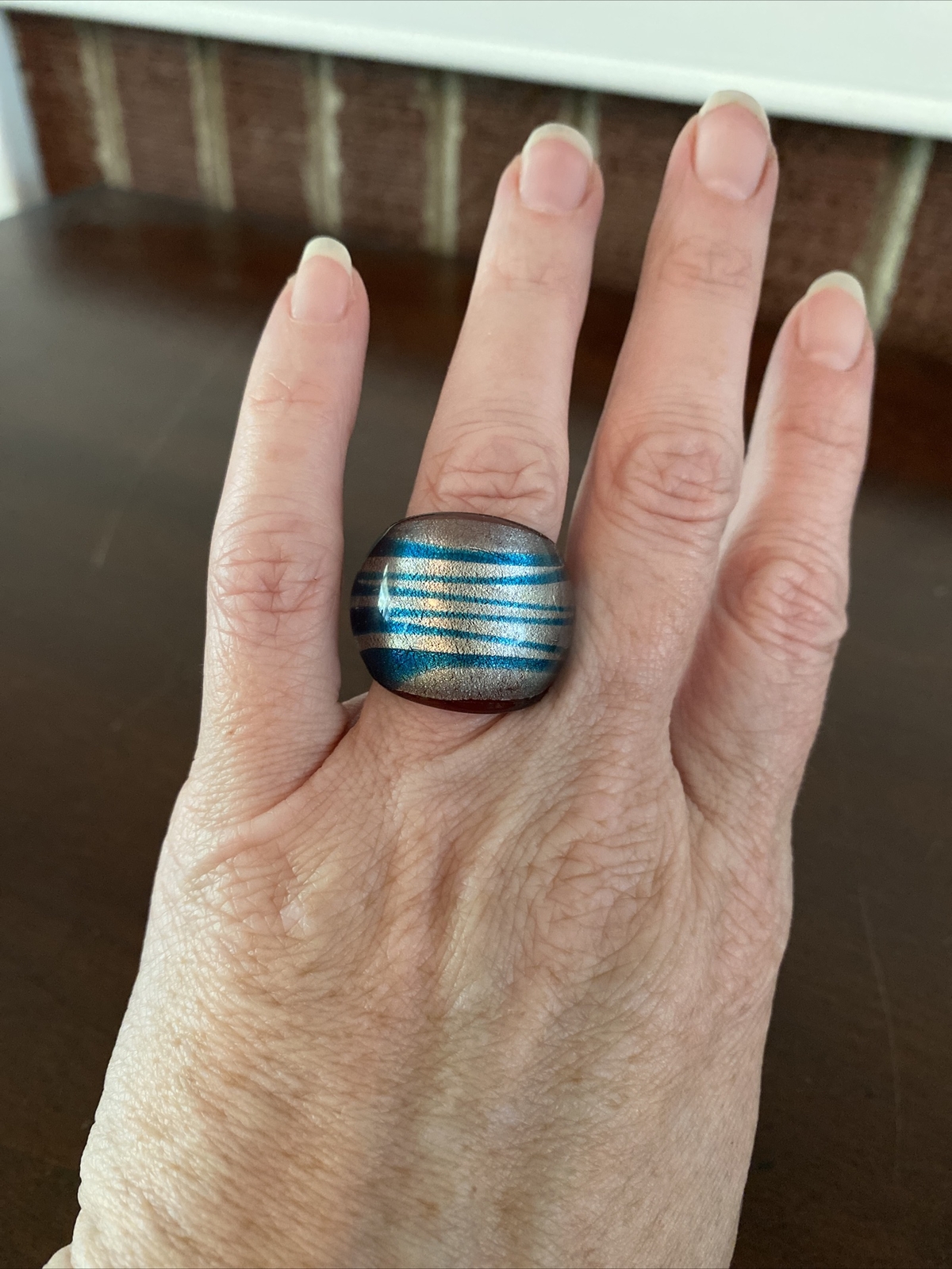 как выглядит Handmade Art Glass Chunky Ring Blue And Silver Stripes, Size 7 фото