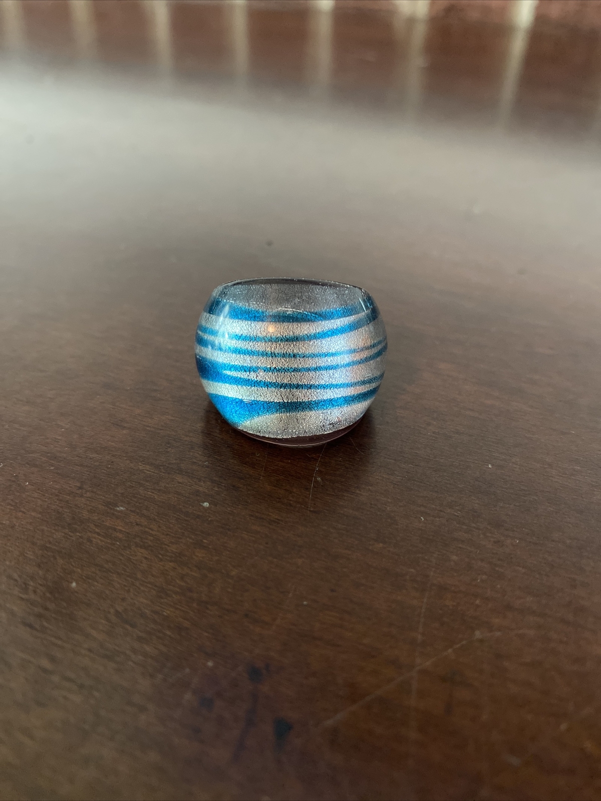 Handmade Art Glass Chunky Ring Blue And Silver Stripes, Size 7