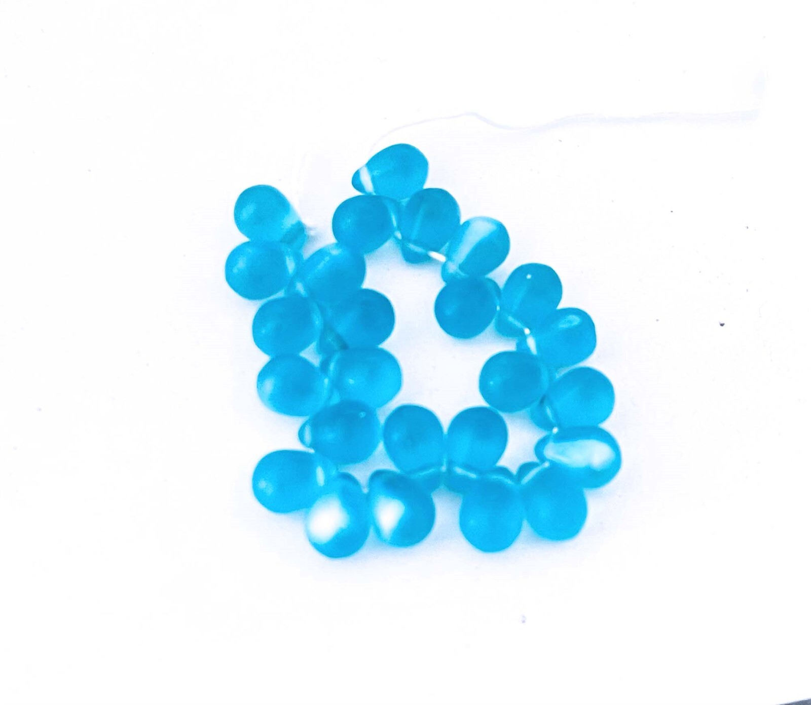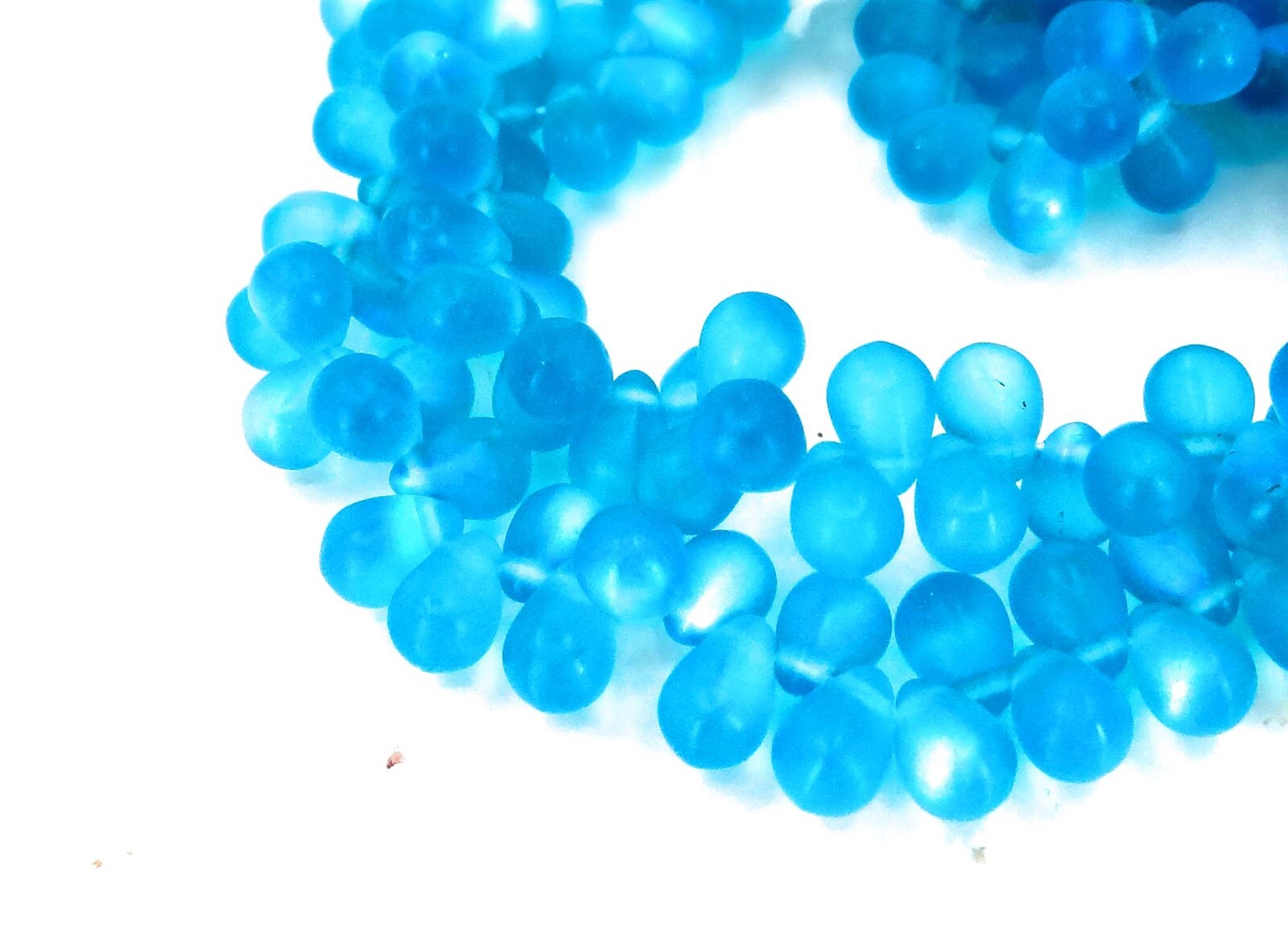 25 Czech Frosted Sea Glass Teardrop Beads 8x6mm - Matte Aquamarine AB moonstone
