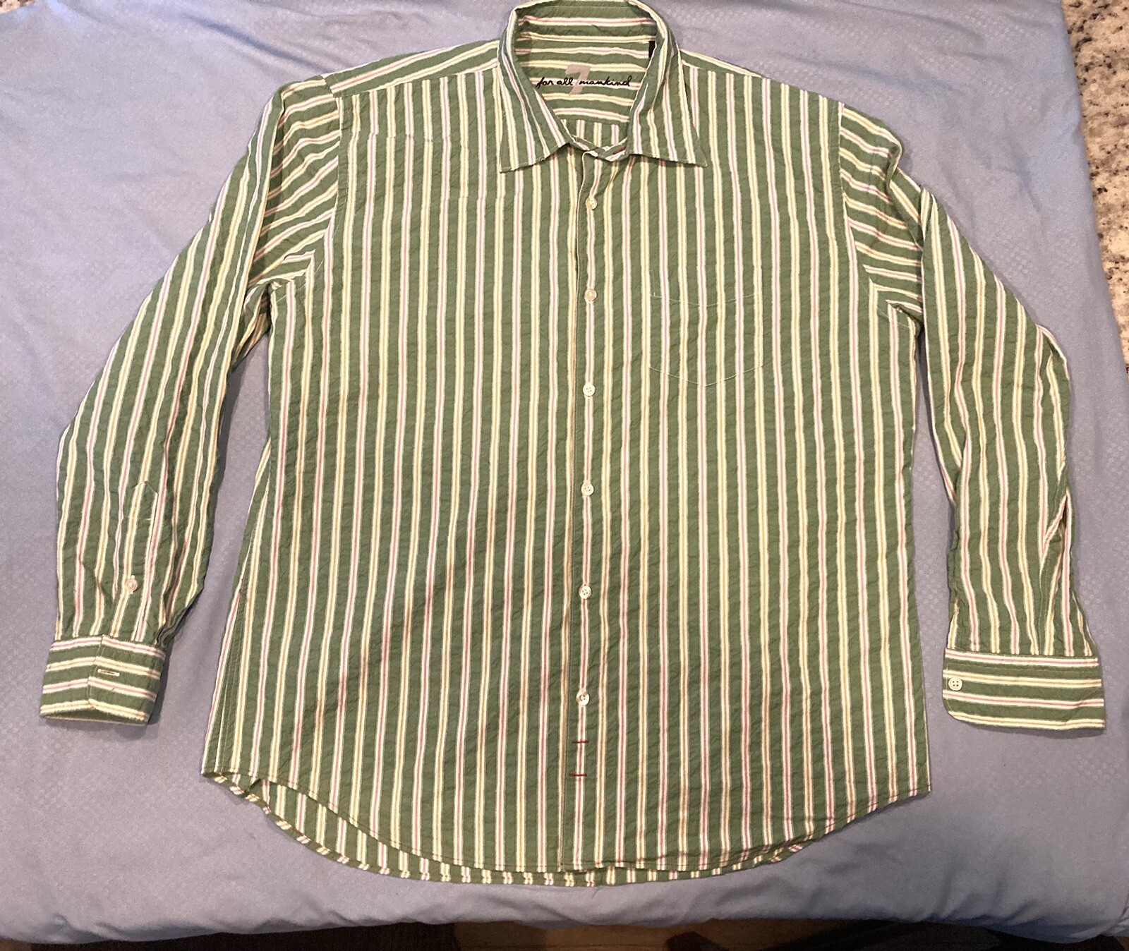 7 For All Mankind Mens Button Down Shirt XL Green Striped Long Sleeve Cotton
