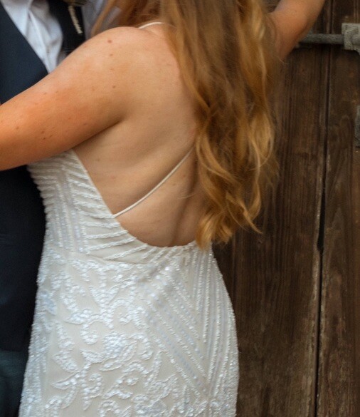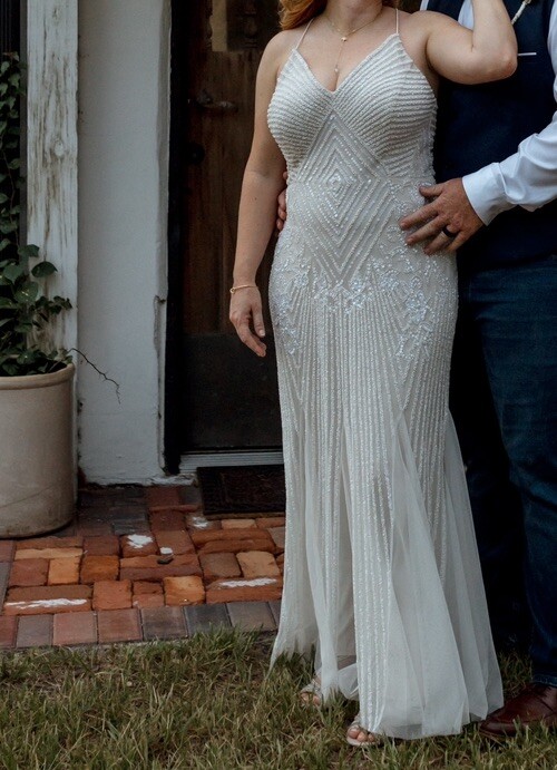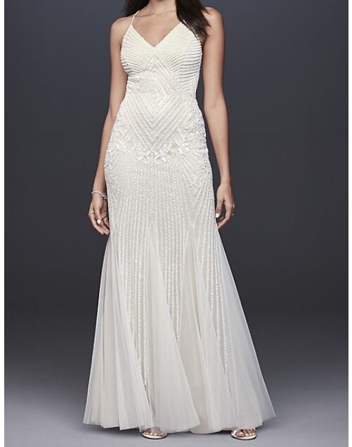 как выглядит Pre-Owned Davids Bridal Studio Beaded Sheath V NECK Dress with Godets фото