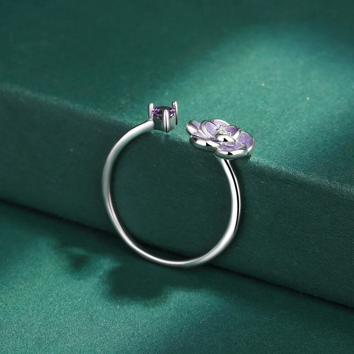 Luxury 925 Sterling Silver Purple Crystal Daisy Flower Adjustable Ring -Size 6-7