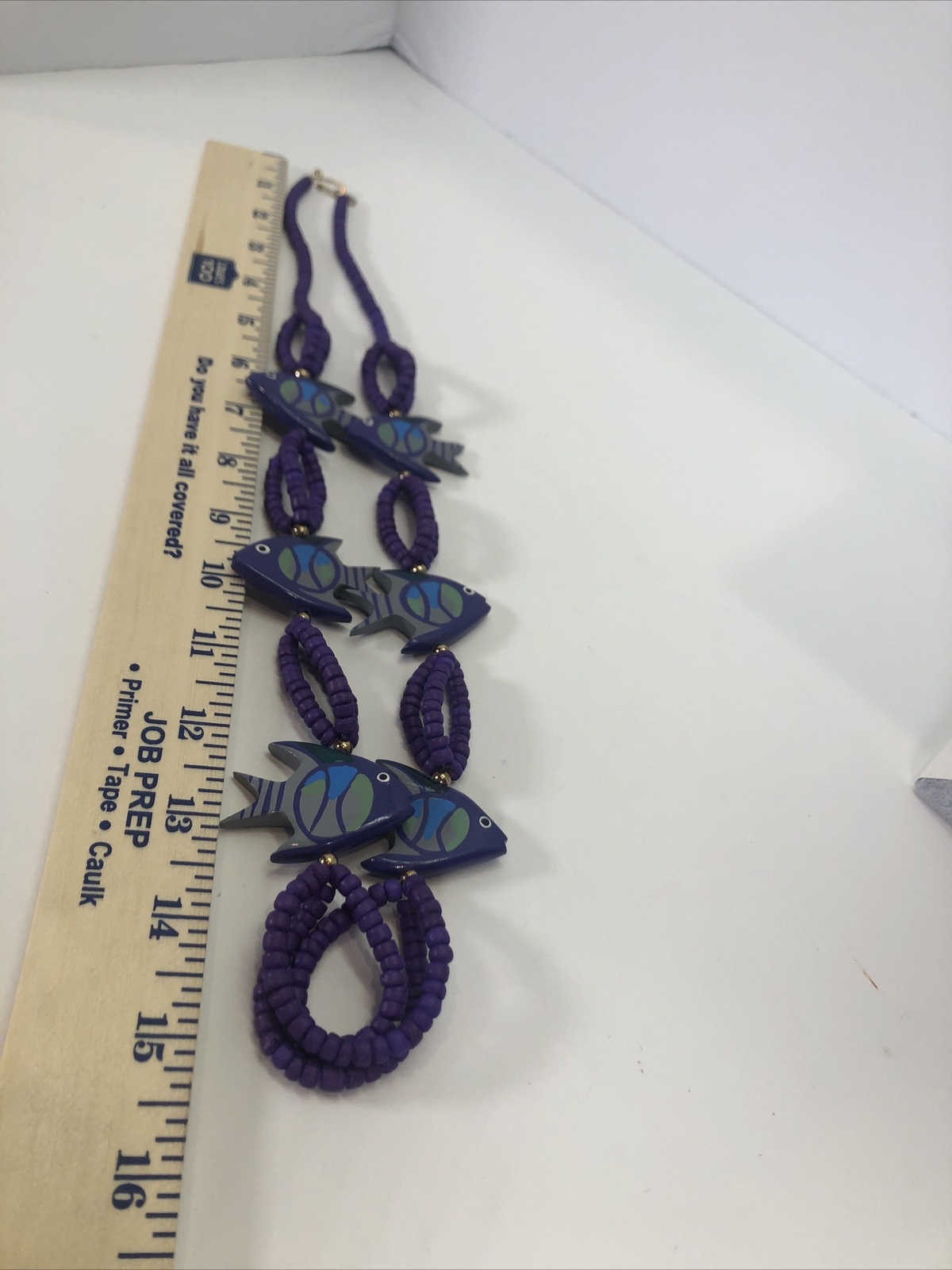 Hand Painted Wooden Beaded Purple Tropical Fish Necklace 15