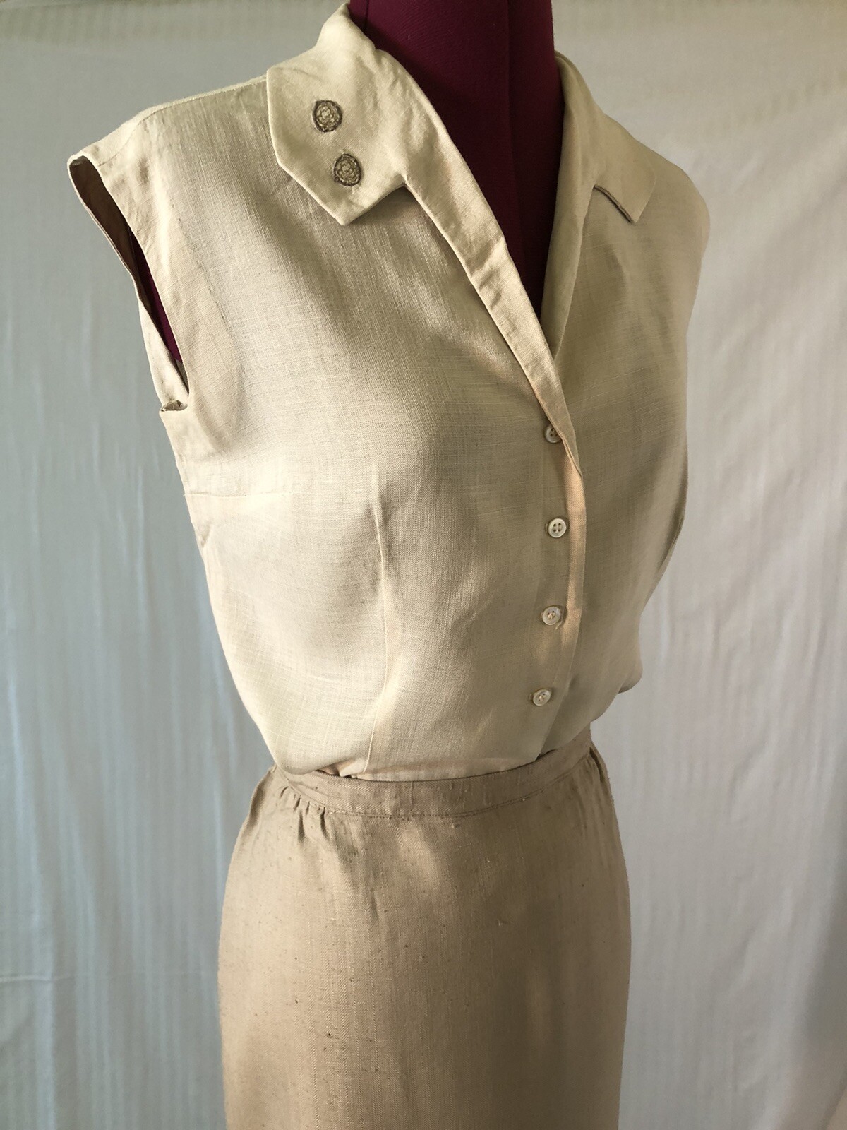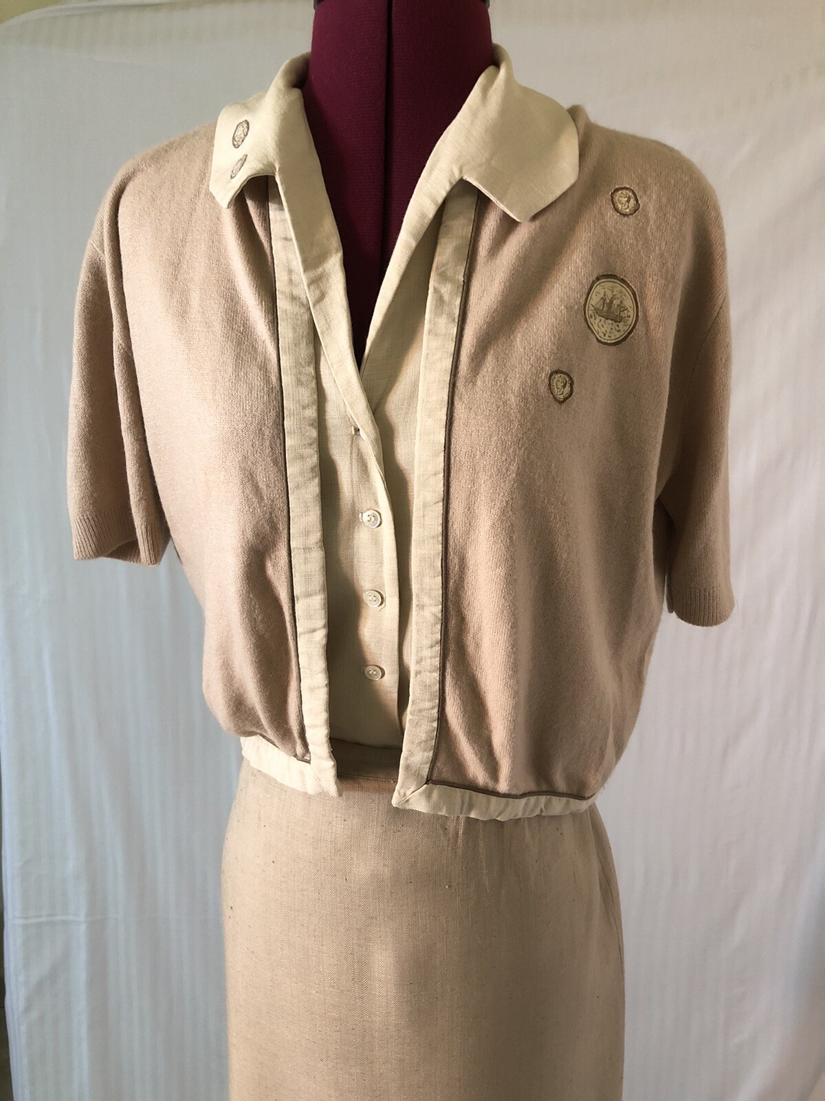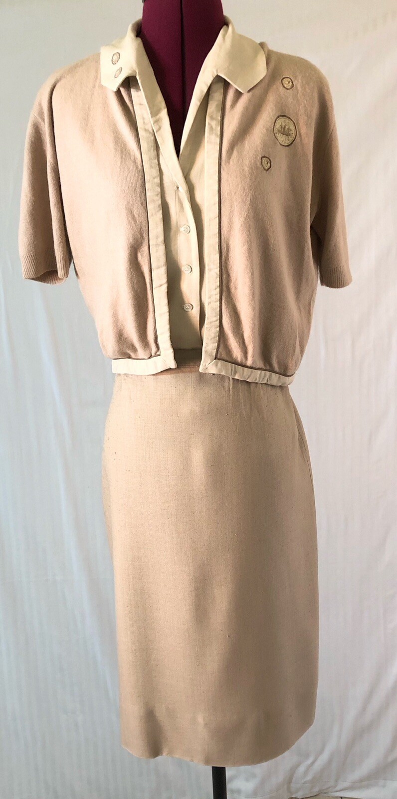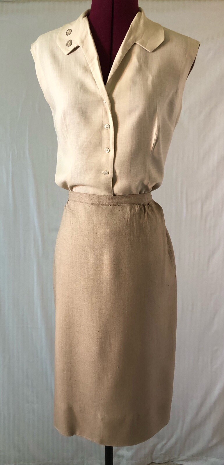 как выглядит 60s Vintage 3 pc sweater blouse Skirt Summer matching Set beige tan tones w 29 фото