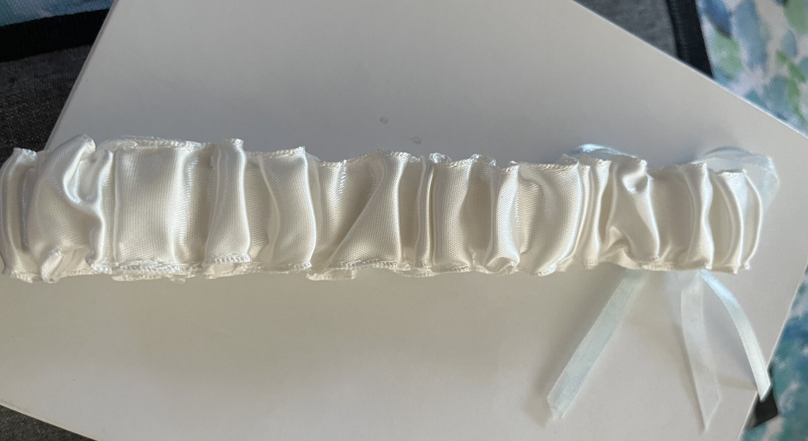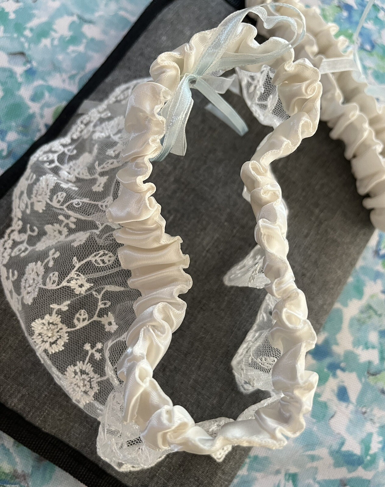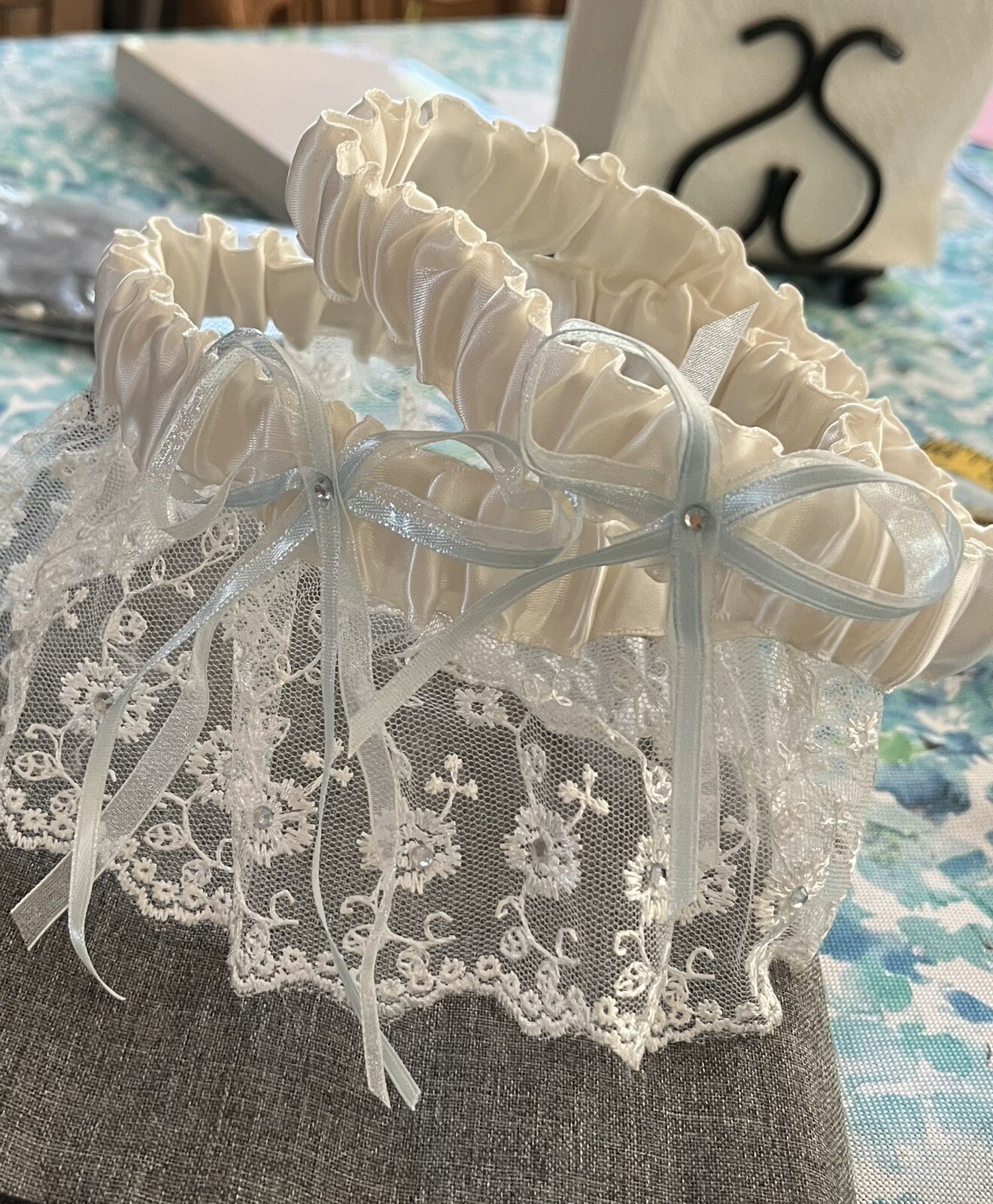 как выглядит Two Matching Garter Sets By Mariell, Ivory Satin And Embroidered lace Lovely фото