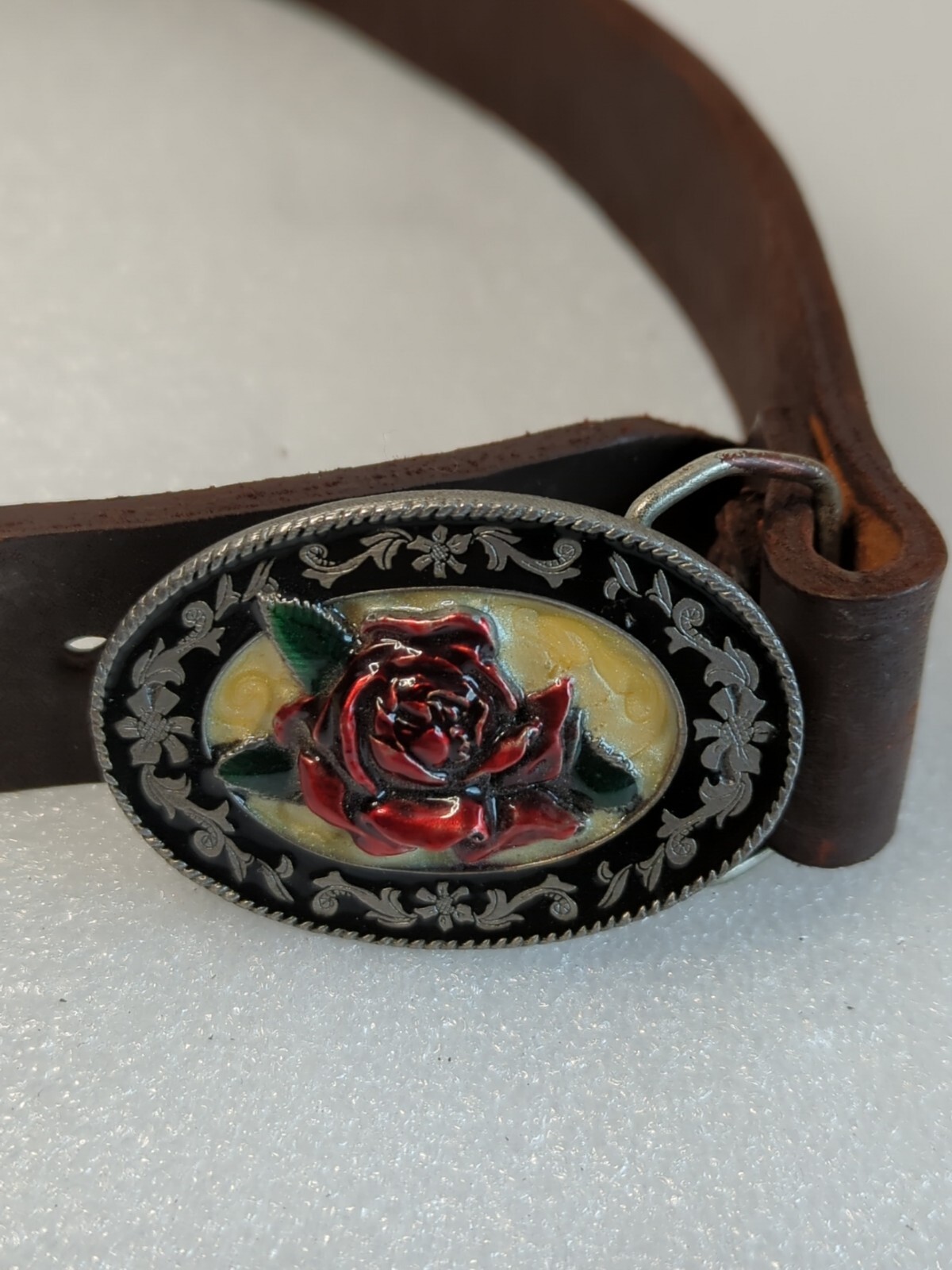 Western Rose Small Siskiyou Belt Buckle Vtg 1985 Metal 30 Leather Belt 1.25 Wi