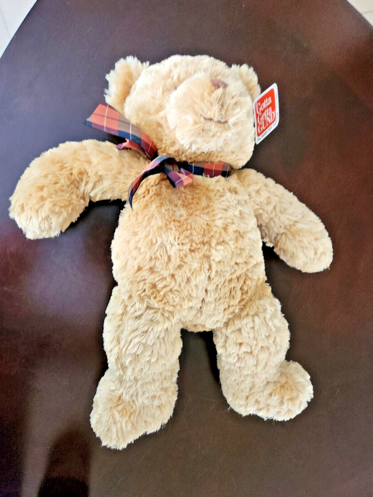 Vintage Gund Teddy Bear Blonde w/ Blue Orange Plaid Ribbon Bow Tie feet 18
