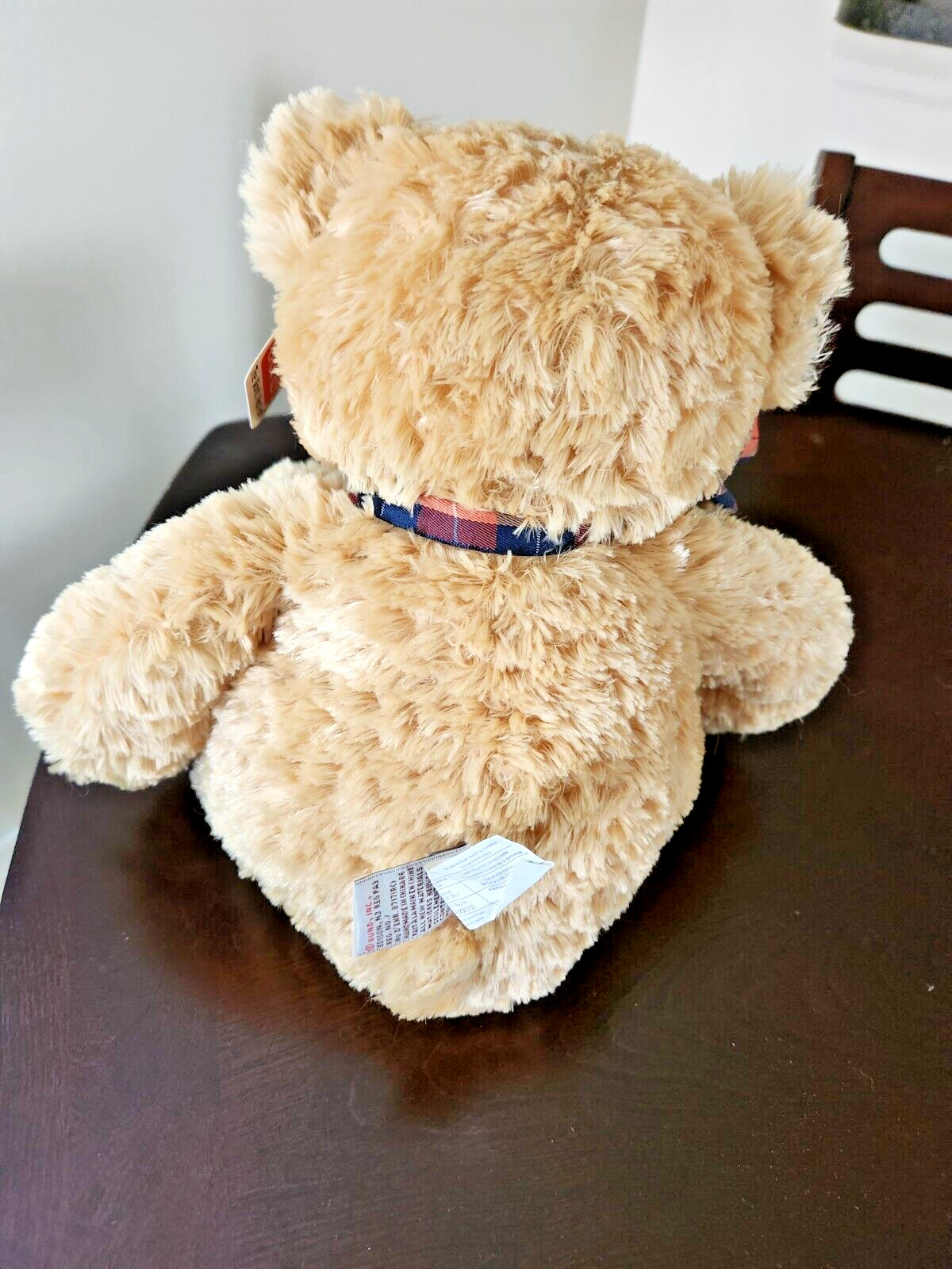 как выглядит Vintage Gund Teddy Bear Blonde w/ Blue Orange Plaid Ribbon Bow Tie feet 18 фото