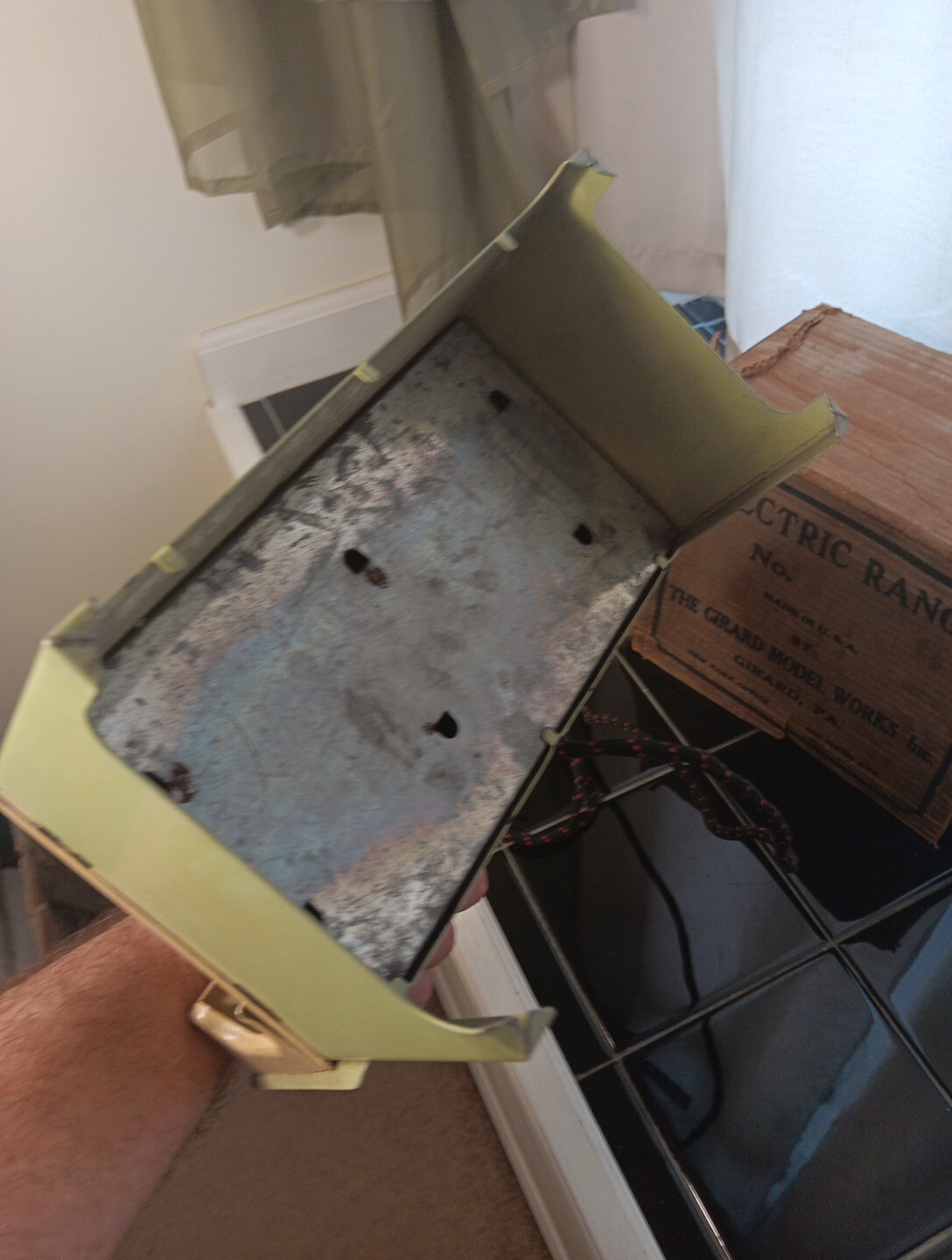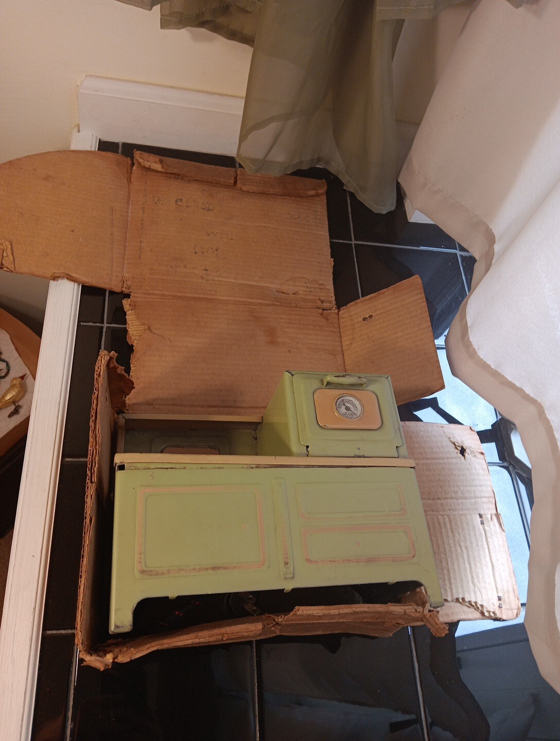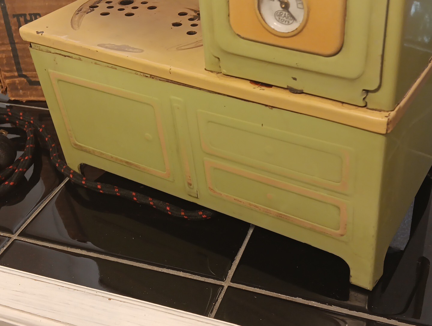 как выглядит GIRARD TOYS Metal Electric Stove Oven w/Gauge Green W/ Rare Original Box Works фото