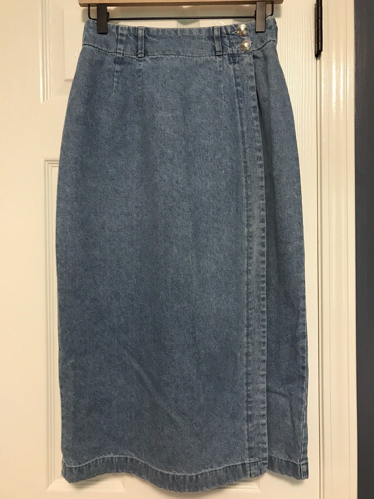 Vintage 80s Ruff Hewn Denim Wrap Skirt USA Light Wash High Waist Pencil Size 4P