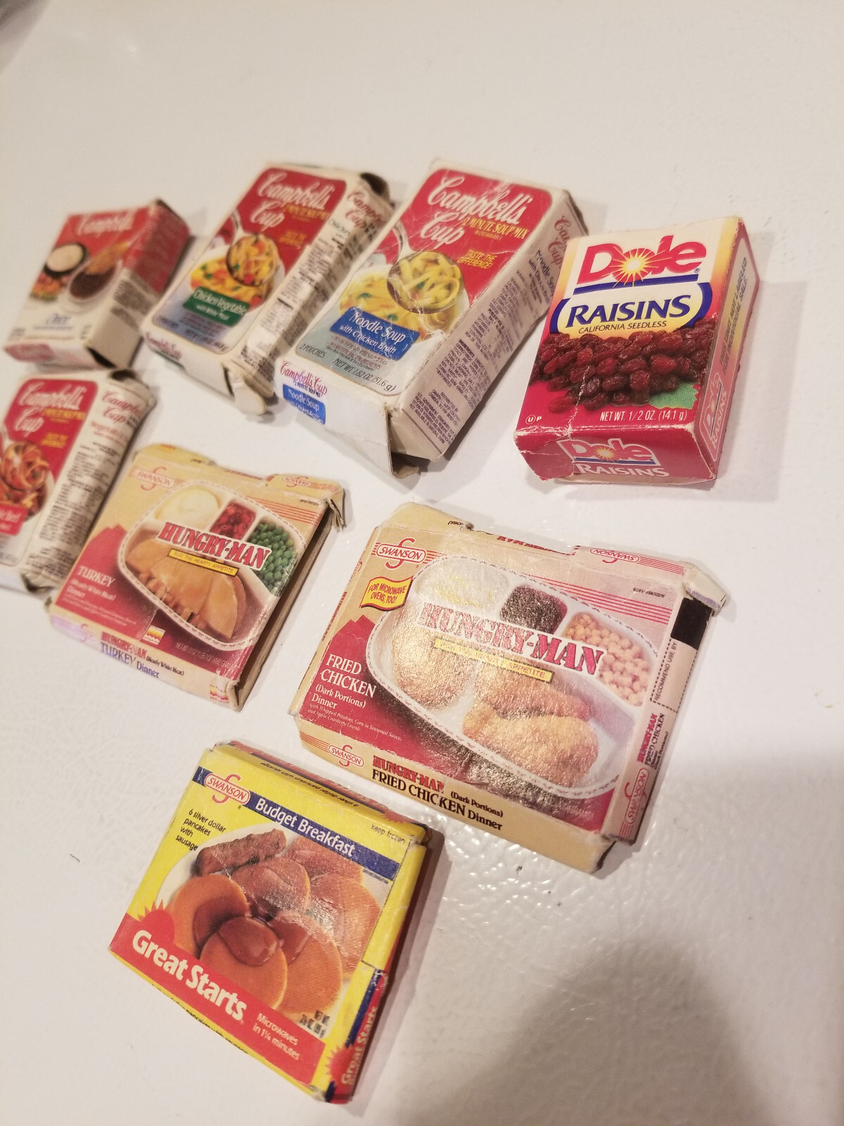 как выглядит 8 Piece Lot Vintage Pretend Play Kitchen Food Boxes Hungry Man, Campbell soup фото