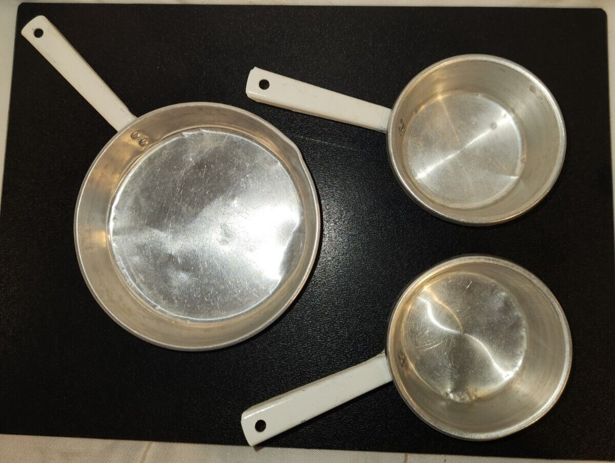 как выглядит Vintage Aluminum Child Cookware Teakettle, colander, bowl, sauce pans, skillet фото