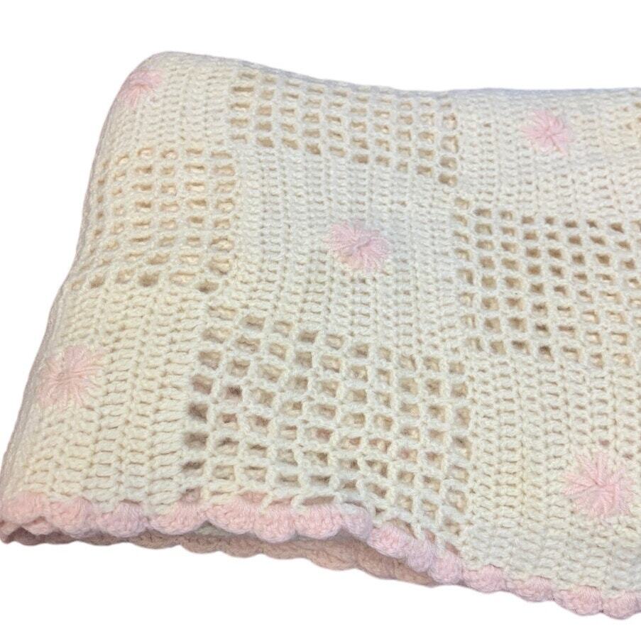Vintage Hand Crocheted Small Scalloped Edge Pink Flower Baby Throw Blanket