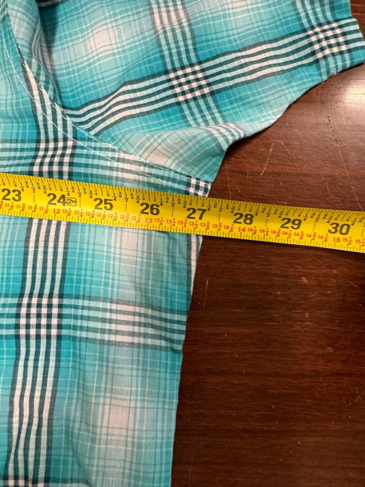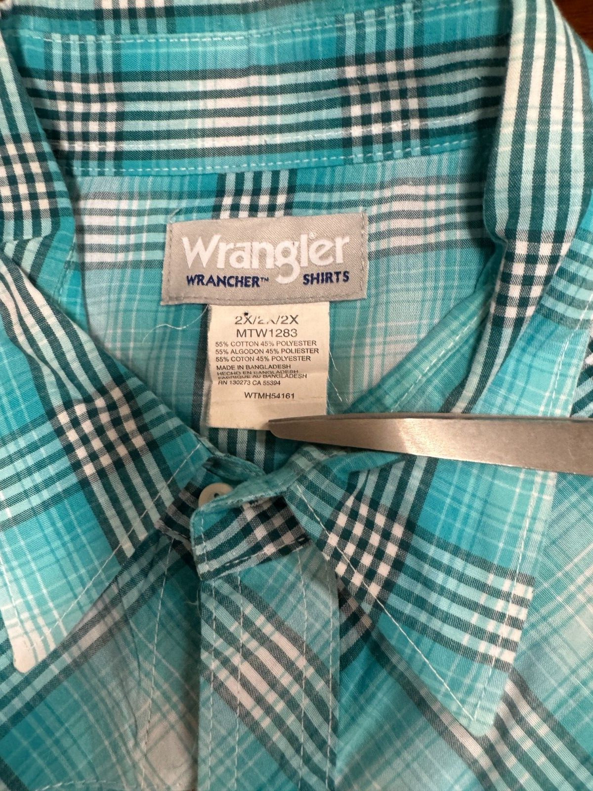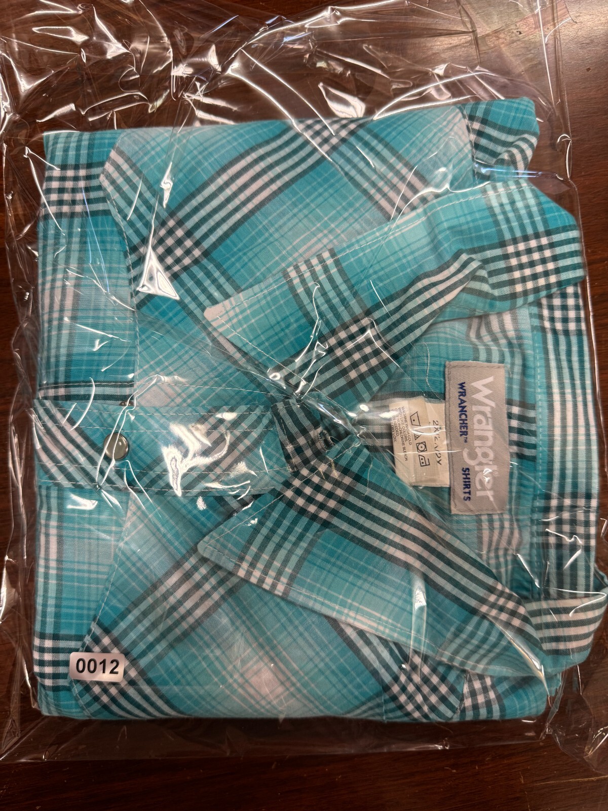 как выглядит Wrangler Wrancher Pearl Snap Western Shirt Mens 2XL Short Sleeve Turquoise Plaid фото