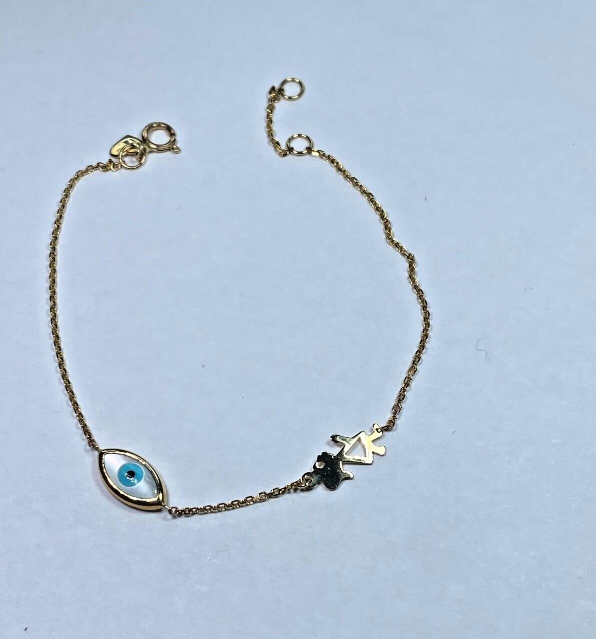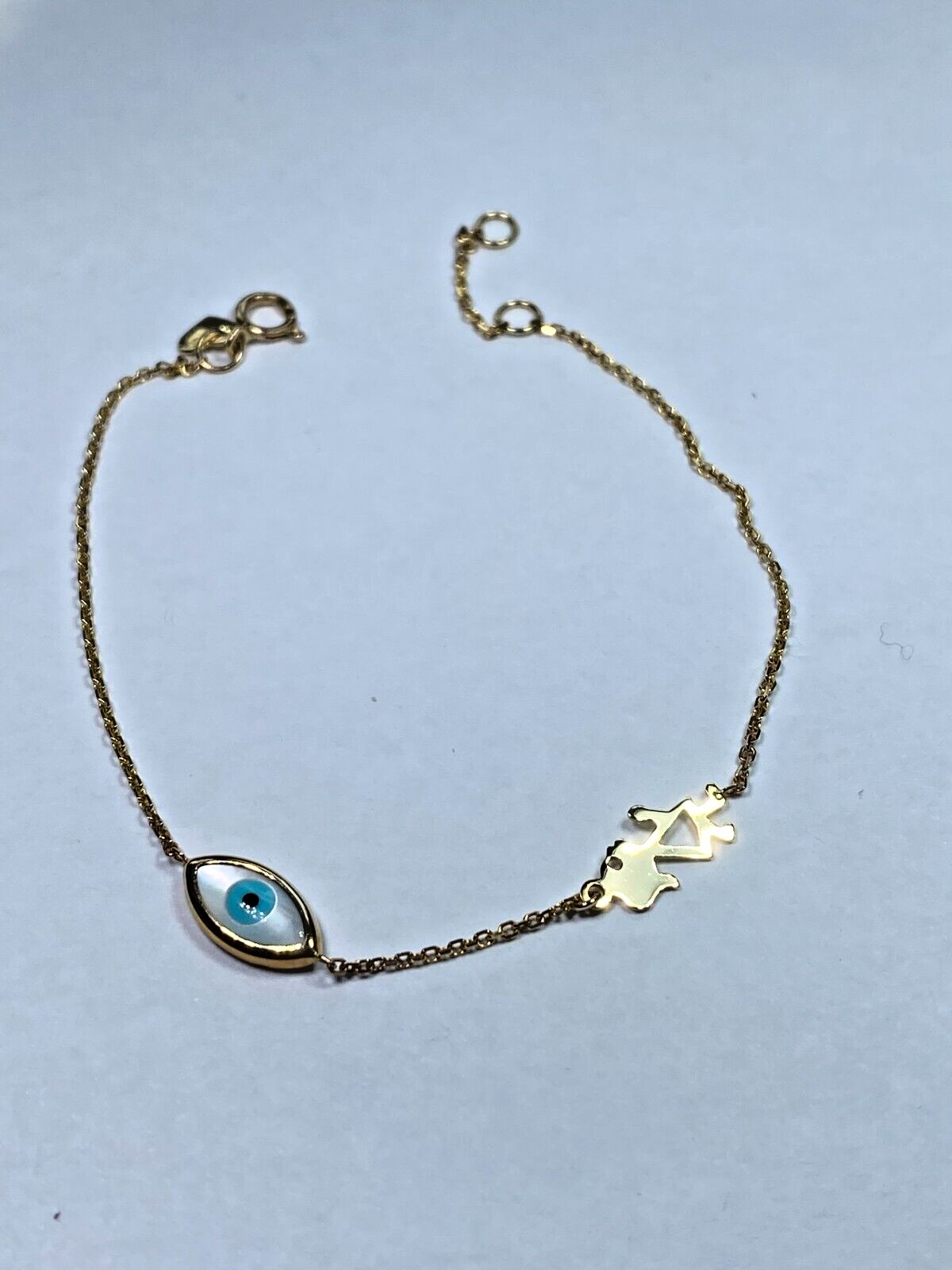 как выглядит 14k Yellow Gold solid Evil Eye white oval 7.5 inch Girl BRACELET Greece Mataki фото